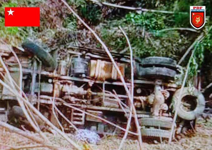 မတ် ၂၅ ရက်ည ၁၀ နာရီ မိနစ် ၂၀ လောက်က ဘော်ဒါကျေးရွာနဲ့ ပေါ်လံကြီးကျေးရွာကြားမှာ မိုင်း ၅ လုံးဖောက်ခွဲပြီး လက်နက်ငယ်တွေနဲ့ပါ ကြားဖြတ်တိုက်ခိုက်ခဲ့တဲ့အတွက် အင်အား ၃၀ လောက်ပါ စစ်ကောင်စီတပ်ဖွဲ့ဝင်တွေ စီးနင်းလာတဲ့ စစ်ကားတစီး ချောက်ထဲထိုးကျခဲ့တာလို့ ပြည်ခရိုင်တပ်ရင်း ၃၆၀၂ သတင်းနှင့် ပြန်ကြားရေးတာဝန်ခံ ရဲဘော် Red Star က DVB ကို ပြောပါတယ်။