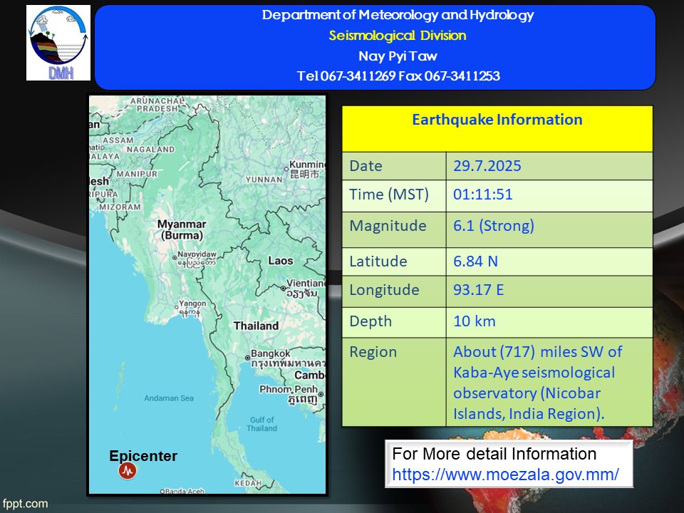 မြန်မာစံတော်ချိန် မနက် ၁ နာရီ ၁၁ မိနစ်က မြန်မာနိုင်ငံပြည်ပ အိန္ဒိယနိုင်ငံ နီကိုဘားကျွန်းနားမှာ အနက် ၁၀ ကီလိုမီတာလောက်ကို ဗဟိုပြုပြီး အင်အားရစ်ချ်တာစကေး ၆ ဒသမ ၁ အဆင့် အင်အားပြင်းထန်တဲ့ မြေငလျင်တခုလှုပ်ရှားသွားတာကို တိုင်းထွာရရှိတယ်လို့ ဆိုပါတယ်။