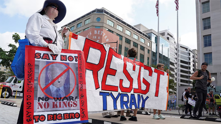 အမေရိကန်နိုင်ငံ မြို့တော် ဝါရှင်တန်ဒီစီရဲ့ မြို့လယ်မှာ ဆန္ဒပြသူ ဒါဇင်များစွာက “စည်းလုံးညီညွတ်တဲ့ ပြည်သူတွေက ရှုံးနိမ့်မှာမဟုတ်ဘူး” လို့ ကြွေးကြော်ရင်း ဒီစီကို လက်လွှတ်လို့ ရေးထားတဲ့ ဆိုင်းဘုတ်တွေကို ကိုင်ဆောင်ပြီး သြဂုတ် ၁၁ ရက်က ဆန္ဒပြခဲ့ကြပါတယ်။