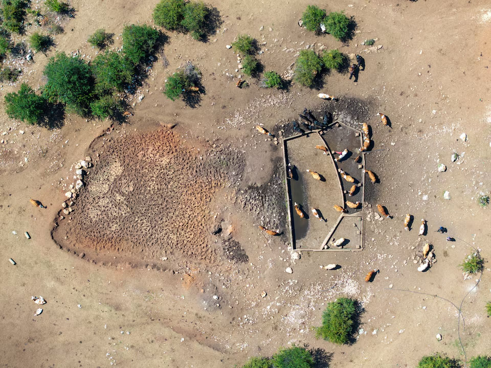 ရေငတ်နေတဲ့ နွားတွေနဲ့ မြင်းကောင်ရေ ၁,၀၀၀ လောက်ဟာ ရေဖြည့်ထားတဲ့ တွင်းတွေနဲ့ စမ်းချောင်းတွေဘေးမှာ ရှိနေပြီး ဗွက်အိုင်တွေက ညစ်ပတ်နေတဲ့ ရေတွေကို သောက်နေရပါတယ်။