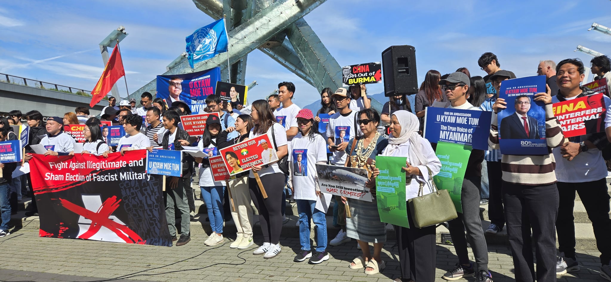 ဒီကနေ့ အမေရိက်နိုင်ငံ နယူးယောက်မြို့ ကုလသမဂ္ဂဌာနချုပ်အနီးကျင်းပတဲ့ ဆန္ဒပြပွဲမှာတော့ သံအမတ်ကြီး ဦးကျော်မိုးထွန်းကိုယ်တိုင် ပါဝင်တက်ရောက်ခဲ့ပါတယ်။