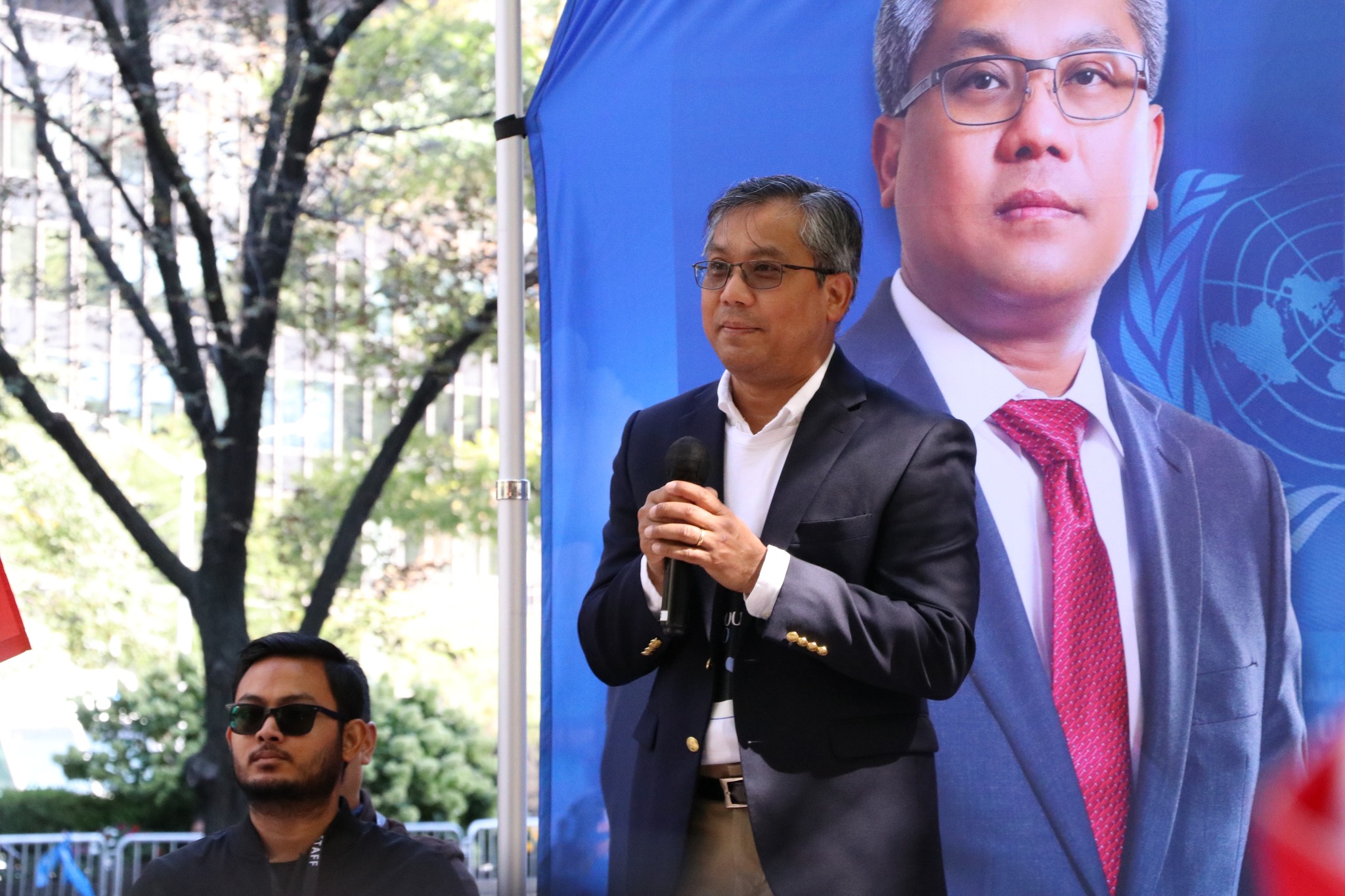 အမေရိကန်ပြည်ထောင်စု၊ နယူးယောက်မြို့ ကုလသမဂ္ဂရုံးချုပ်အနီးမှာ ဒေသစံတော်ချိန် စက်တင်ဘာ ၂၀ ရက်မွန်းလွဲပိုင်းက ကုလသမဂ္ဂဆိုင်ရာ မြန်မာအမြဲတမ်းကိုယ်စားလှယ်၊ သံအမတ်ကြီးဦးကျော်မိုးထွန်း ရာထူးတာဝန် ဆက်လက်ထမ်းဆောင်နိုင်ရေး အားပေးထောက်ခံပွဲ ကျင်းပတာမှာ သံအမတ်ကြီးကိုယ်တိုင် တက်ရောက်ပြီး ပြောကြားခဲ့တာပါ။