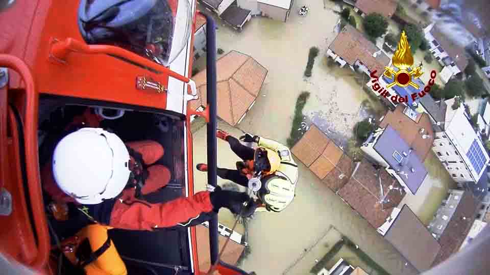 အီတလီနိုင်ငံ မြောက်ပိုင်းမှာ မိုးသည်းထန်စွာရွာသွန်းမှုကြောင့် ပိတ်မိနေတဲ့ ရေဘေးသင့်ဒေသခံတွေကို ကယ်ဆယ်ရေးအဖွဲ့တွေက ရဟတ်ယာဉ်တွေ၊ ကုန်းရေ ၂ သွယ်သုံး ယာဉ်တွေ အသုံးပြုပြီး ကယ်ထုတ်ခဲ့ရပါတယ်။