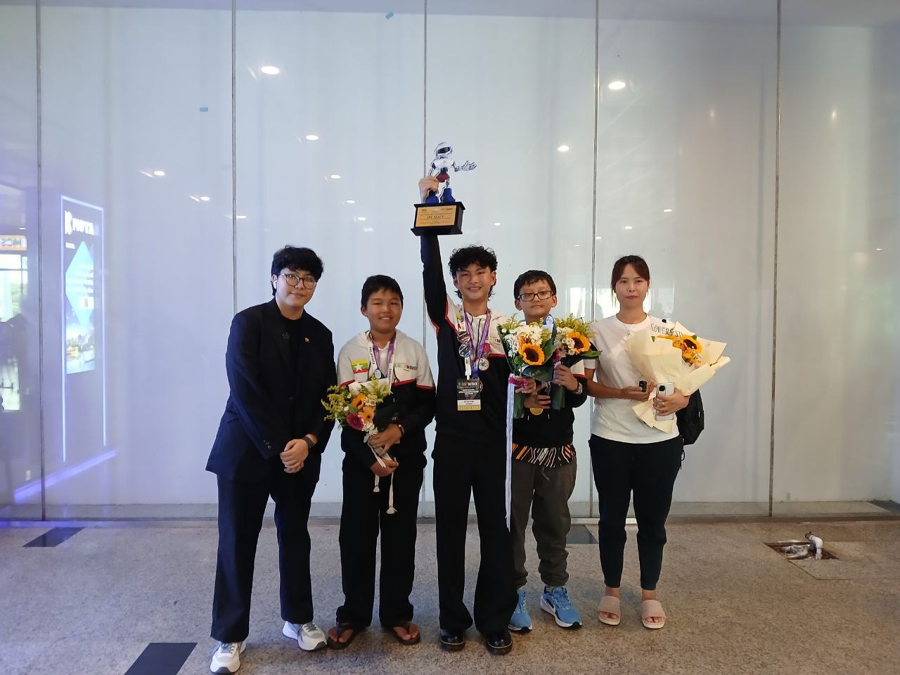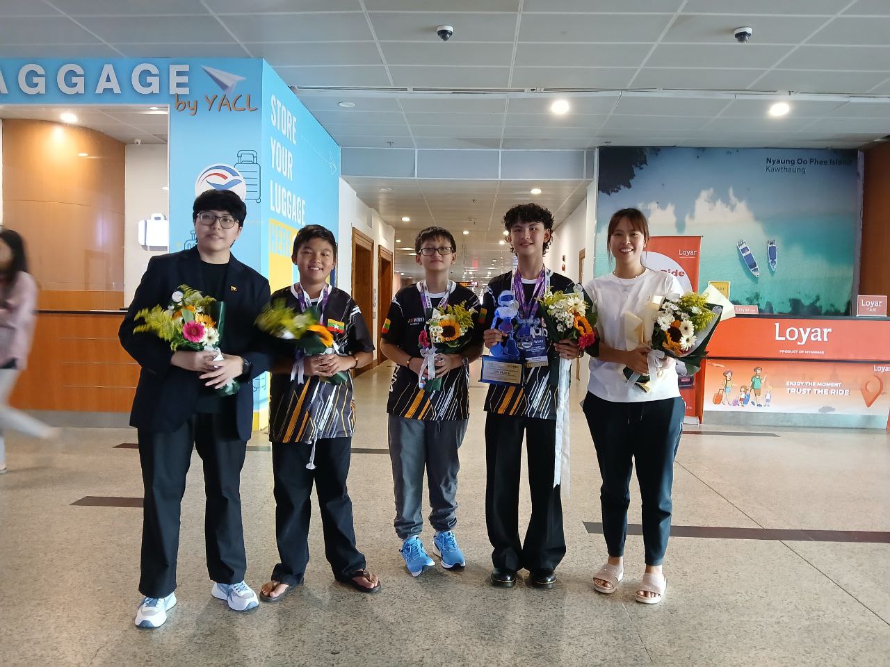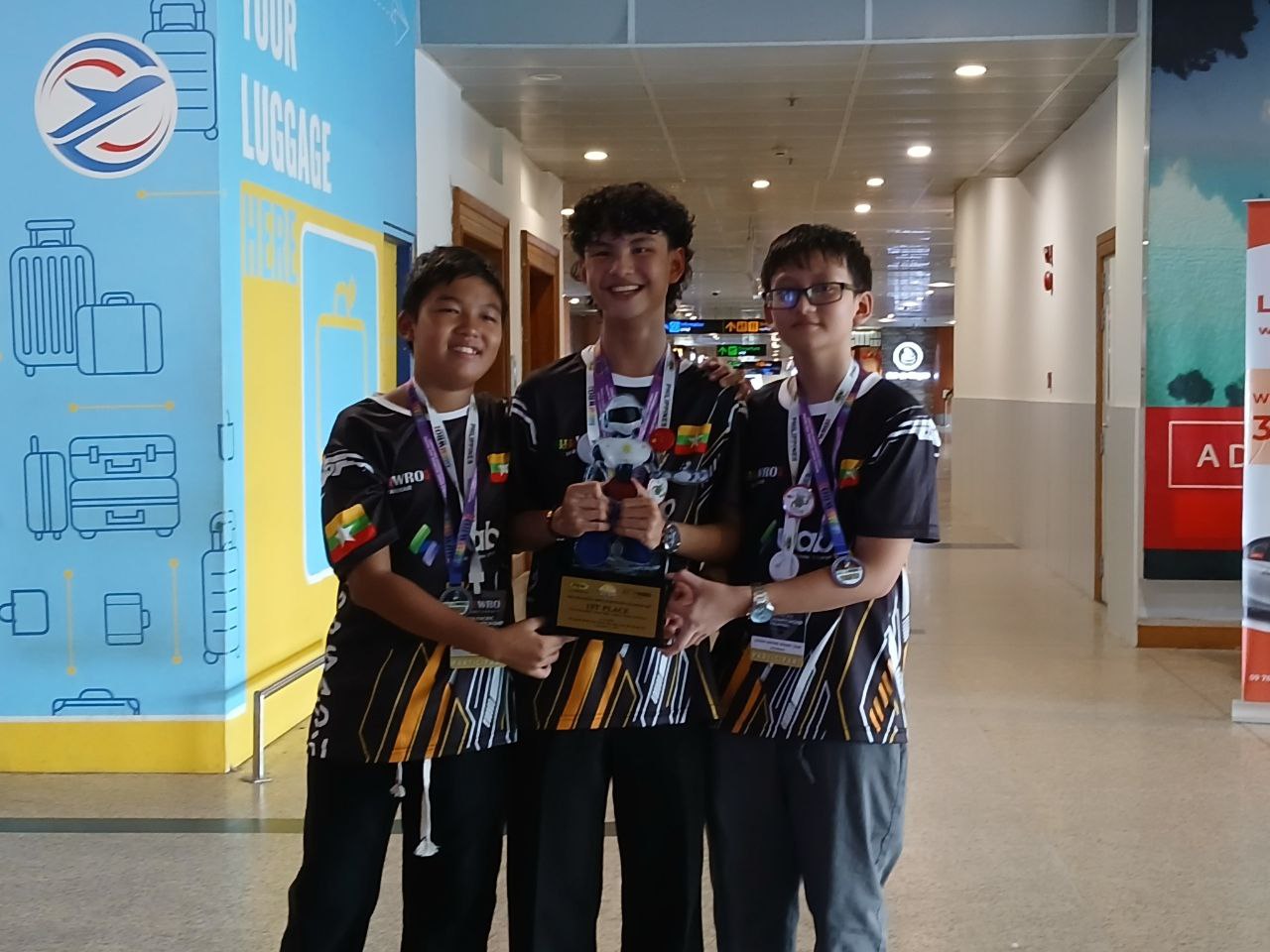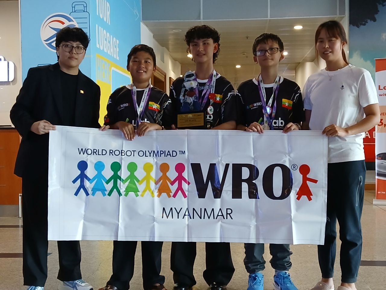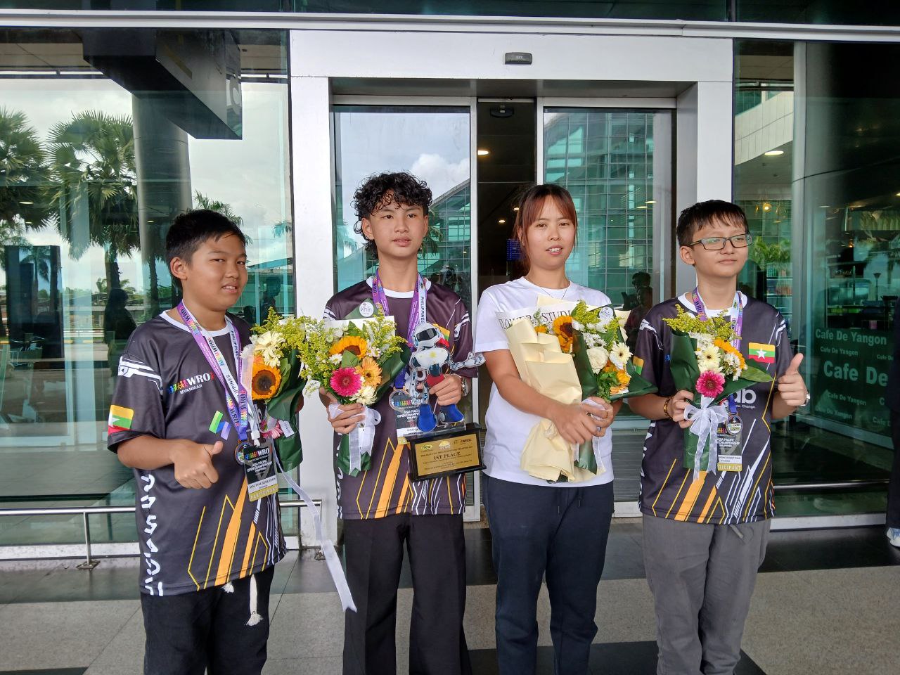 ကမ္ဘာ့အိုလံပစ်စက်ရုပ်ပြိုင်ပွဲမှာ ပထမဆုရရှိခဲ့တဲ့ မြန်မာလူငယ်အဖွဲ့ ဒီကနေ့ စက်တင်ဘာ ၂၄ ရက် နေ့လယ်ပိုင်းမှာ ရန်ကုန်အပြည်ပြည်ဆိုင်ရာလေဆိပ်ကို ပြန်လည် ရောက်ရှိလာပါတယ်။