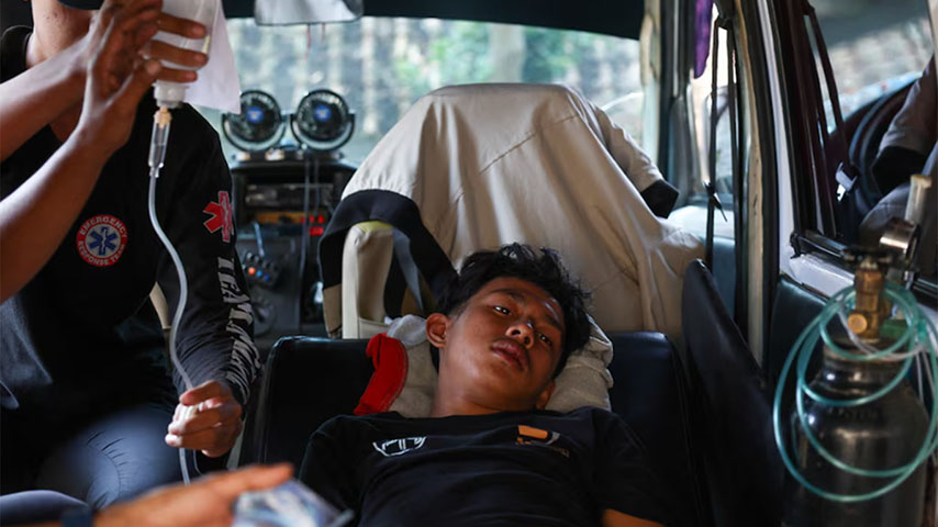 အရေးပေါ်ကုသရေးဌာနအဖြစ် ပြောင်းလဲထားတဲ့ အားကစားခန်းမတခုထဲမှာ စက်တင်ဘာ ၂၅ ရက်က လူနာ ဒါဇင်ပေါင်းများစွာဟာ ယာယီကုတင်တွေပေါ်မှာ လဲလျောင်းနေကြပါတယ်။