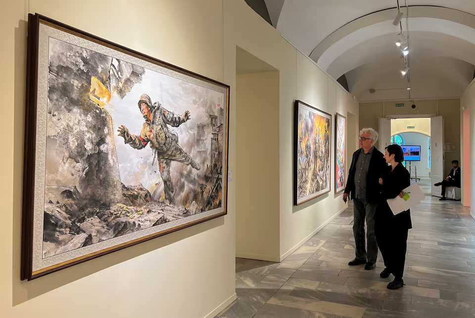 ရုရှားနဲ့ မြောက်ကိုရီးယားတပ်ဖွဲ့ဝင်တွေ ရုရှားနိုင်ငံ ကာ့စ်ခ်ဒေသမှာ ယူကရိန်းတပ်တွေကို အောင်ပွဲခံရင်း ၂ နိုင်ငံ အလံတွေကို ကိုင်ဆောင်ပြုံးပျော်နေတဲ့ ပန်းချီကားတချပ်နဲ့ ယူကရိန်းတပ်တွေကို ပစ်ခတ်တိုက်ခိုက်နေတဲ့ မြောက်ကိုရီးယားအစိုးရတပ်တွေရဲ့ပုံ ပန်းချီကားကို မော်စကိုပြပွဲမှာ ပြသထားပါတယ်။