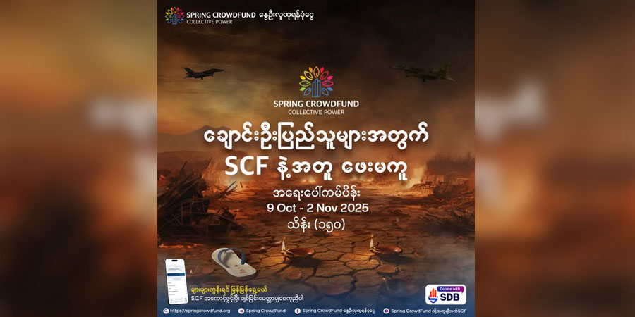 နွေဦးဖွံ့ဖြိုးရေးဘဏ် (SDB) ရဲ့ ပြည်သူကနေ ပြည်သူဆီ ထောက်ပံ့လှူဒါန်းနိုင်တဲ့ Spring Crowd Fund (နွေဦးလူထု ရန်ပုံငွေ) ဝက်ဘဆိုက်က “ချောင်းဦးပြည်သူများအတွက် SCF နဲ့အတူ ဖေးမကူ” ဆိုတဲ့ အရေးပေါ်ကမ်ပိန်းတရပ်ကို အောက်တိုဘာ ၉ ရက်ကစပြီး ၂၄ ရက်ကြာ ပြုလုပ်သွားမယ်လို့ ဆိုပါတယ်။