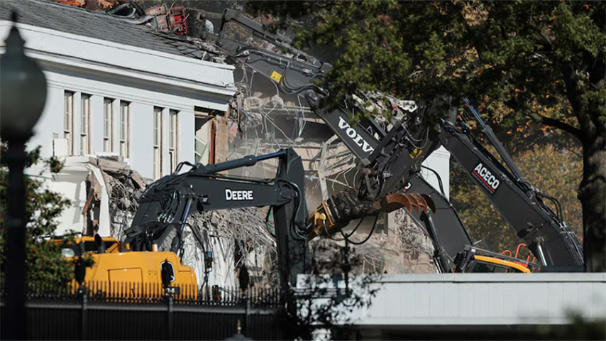 အခုအခါ သမ္မတကတော်နဲ့ တခြားဝန်ထမ်းရုံးတွေ ထားရှိတဲ့ အိမ်ဖြူတော် အရှေ့ဆောင်တခုလုံးကို ဖြိုချလိုက်ပြီ ဖြစ်ပါတယ်။