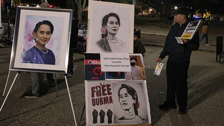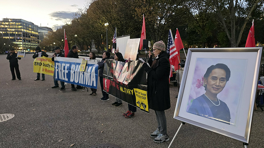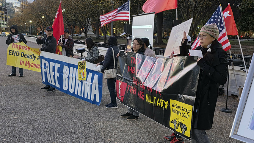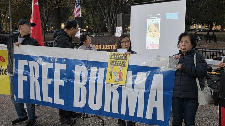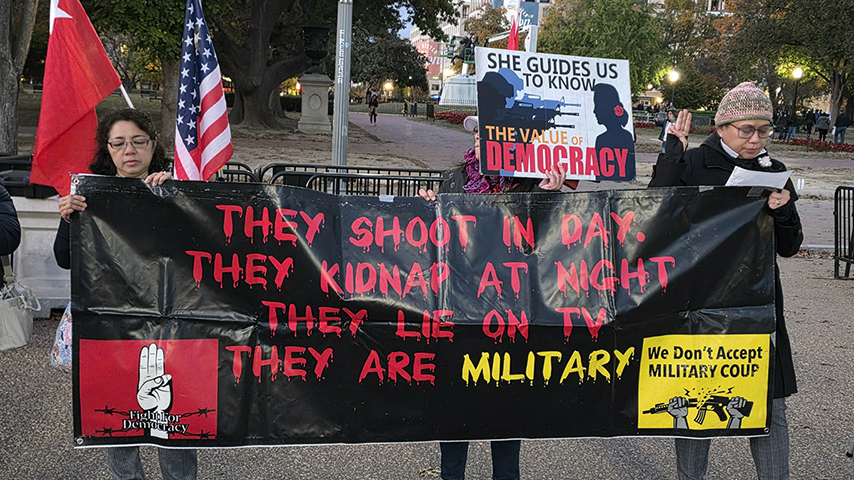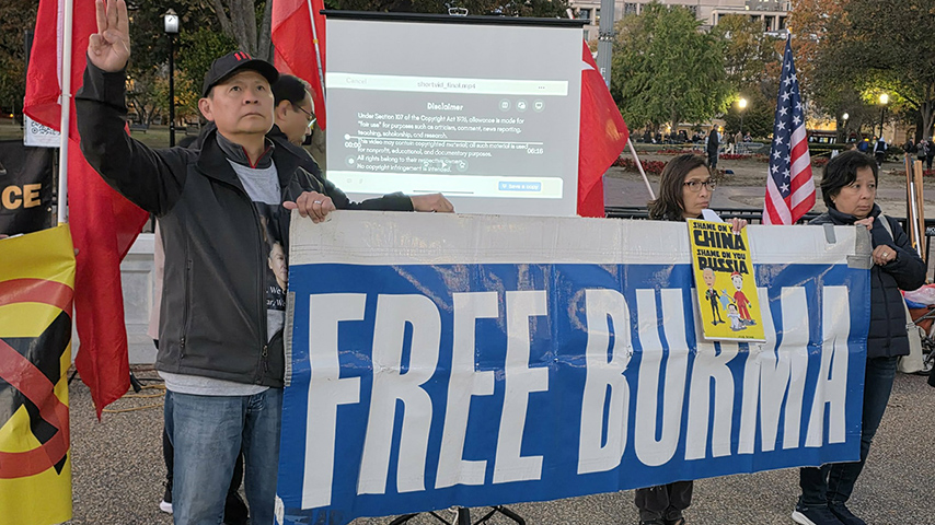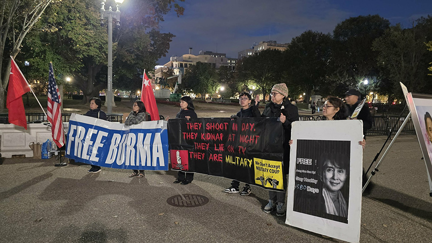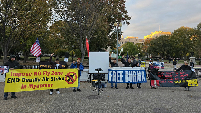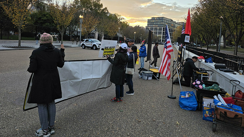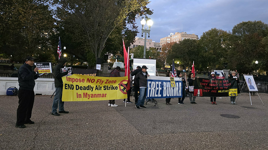 အာဆီယံအစည်းအဝေး တက်ရောက်တဲ့အချိန်မှာ စစ်ရာဇဝတ်မှုကို ကျူးလွန်နေတဲ့ စစ်ခေါင်းဆောင်ကို အမေရိကန်သမ္မတက တရားဝင်ထုတ်ဖော်ပြောဆိုရှုတ်ချဖို့နဲ့ အတုအယောင်ရွေးကောက်ပွဲကို လက်မခံကြောင်း ပြောဆိုပေးဖို့ သမ္မတအိမ်ဖြူတော်ရှေ့မှာ အမေရိကန်ရောက် မြန်မာ့အရေးဆောင်ရွက်သူတွေ သွားရောက်တောင်းဆို ဆန္ဒထုတ်ဖော်ခဲ့ကြပါတယ်။