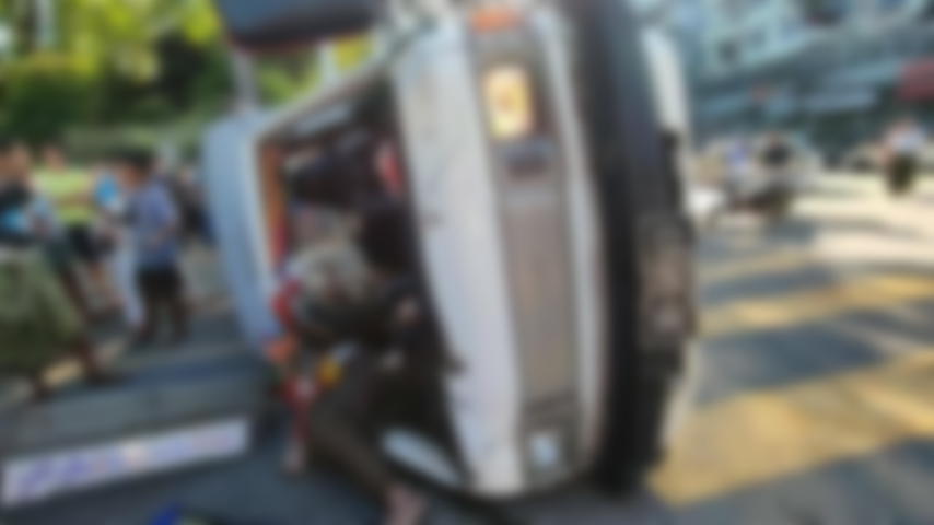 ရန်ကုန်မြို့လယ်က ဗိုလ်အောင်ကျော်လမ်း နဲ့ မဟာဗန္ဓုလလမ်းဒေါင့် မီးပွိုင့်မှာ အောက်ဆိုက်ကား တစီးတိမ်းမှောက်ပြီး ယာဉ်မောင်းအမျိုးသား သေဆုံးကာ ၆ ဦး ဒဏ်ရာရခဲ့တယ်လို့ သွားရောက်ကူညီခဲ့တဲ့ လူမှုကူညီရေးအသင်းတွေဆီက သိရပါတယ်။
