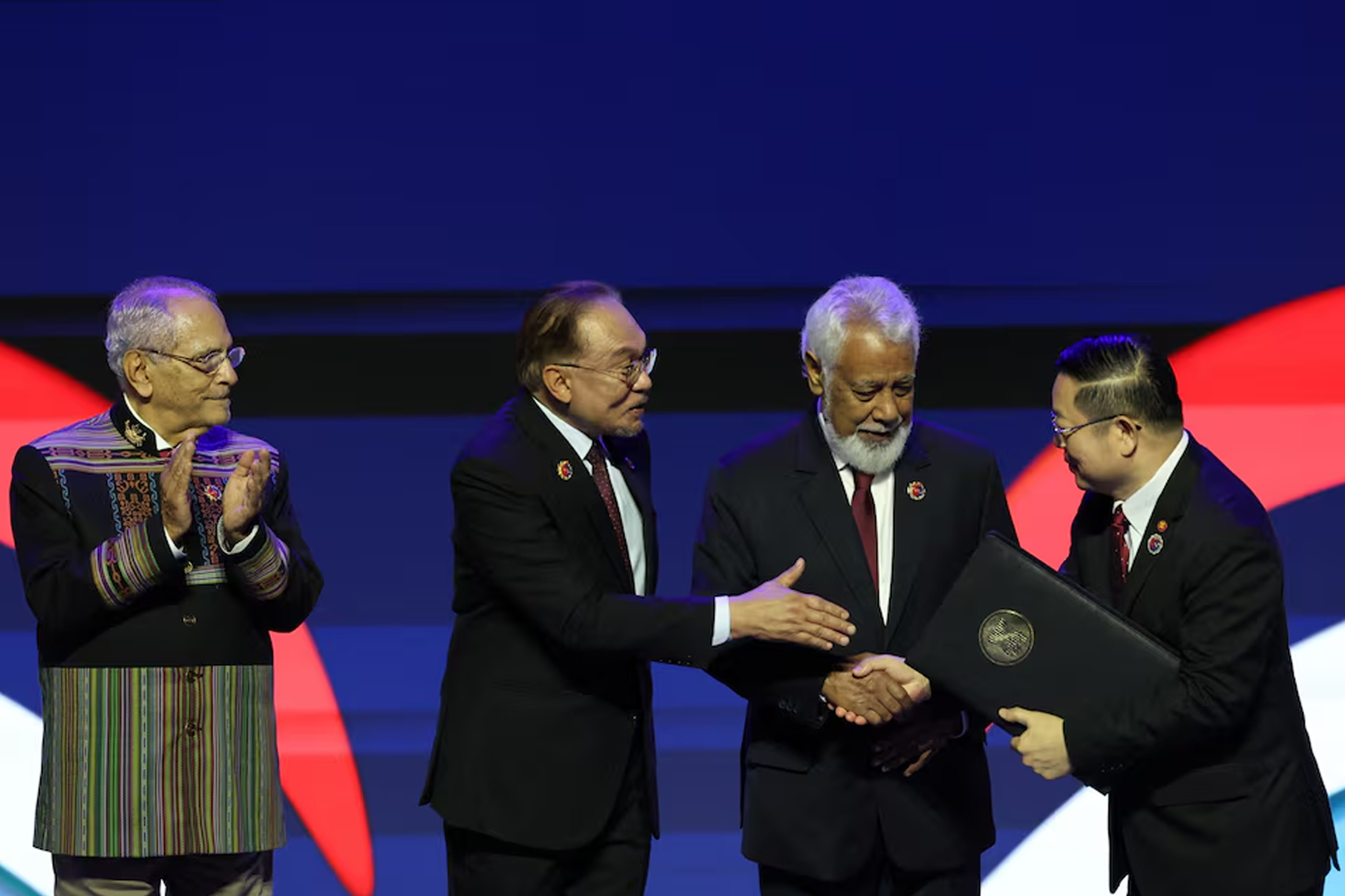 အရှေ့တောင်အာရှနိုင်ငံများအသင်း (အာဆီယံ) ရဲ့ အောက်တိုဘာ ၂၆ ရက်က ကွာလာလမ်ပူမှာ ကျင်းပတဲ့ ထိပ်သီးအစည်းအဝေးဖွင့်ပွဲမှာ အာဆီယံခေါင်းဆောင်တွေက အာရှတိုက်ရဲ့ သက်တမ်းအငယ်ဆုံးနိုင်ငံဖြစ်တဲ့ အရှေ့တီမောနိုင်ငံကို အာဆီယံဝင်ရောက်ခွင့် တရားဝင် အတည်ပြုခဲ့ပြီးနောက်မှာ အရှေ့တီမောဟာ ၁၁ နိုင်ငံမြောက် အာဆီယံအဖွဲ့ဝင် ဖြစ်လာခဲ့ပါပြီ။