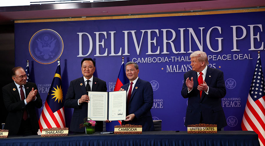 ထရမ့်ပ်ဟာ အာရှခရီးစဉ်ရဲ့ ပထမဆုံးခရီးစဉ်အဖြစ် မလေးရှားနိုင်ငံဆီ ရောက်နေပြီး ဇူလိုင်လမှာ ၅ ရက်ကြာ နယ်စပ်ပဋိပက္ခကို အဆုံးသတ်ဖို့ ထိုင်းနဲ့ ကမ္ဘောဒီးယားတို့ကြားမှာ ကြားဝင် ညှိနှိုင်းပေးခဲ့တာပါ။