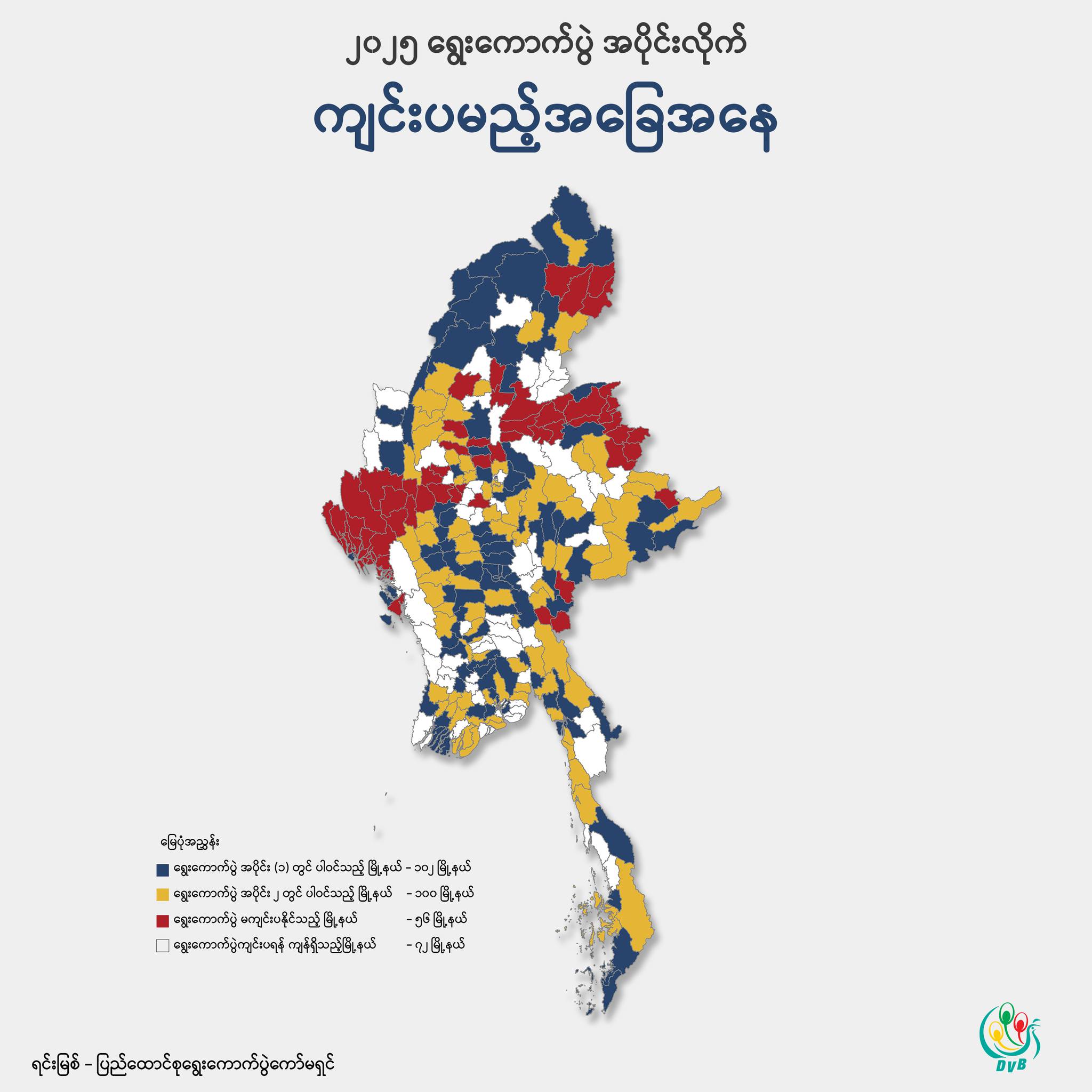 ကယား၊ မွန်နဲ့ မကွေးတို့ကတော့ အပိုင်း ၂ ကျင်းပပြီးချိန်မှာ ရွေးကောက်ပွဲ ကျင်းပမယ်လို့ ကြေညာထားတဲ့ မြို့နယ်တွေမှာ အကုန်ကျင်းပပြီးစီးသွားမှာပဲ ဖြစ်ပါတယ်။
