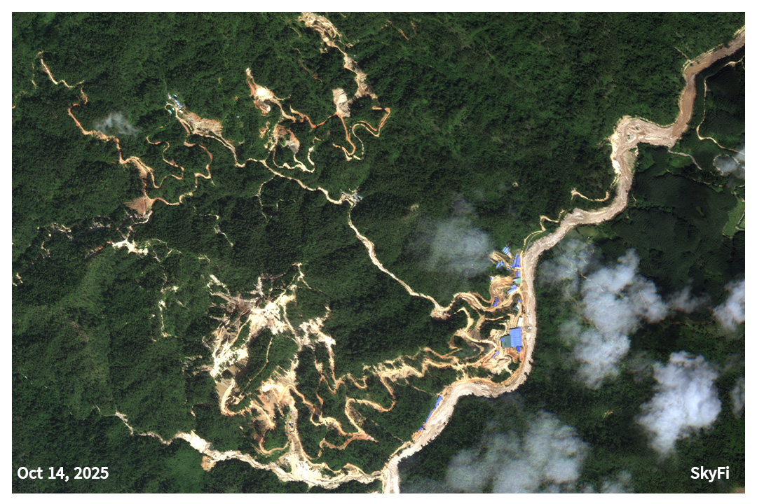 အောက်တိုဘာ ၁၄ ရက်နေ့က ရိုက်ကူးခဲ့တဲ့ ဂြိုဟ်တုဓာတ်ပုံတွေအရ ရှမ်းပြည်အရှေ့ပိုင်း မိုင်းဆတ်မြို့တောင်ဘက် မိုင်းယွန်းဒေသရှိ နမ့်ခုတ်မြစ်တလျှောက်မှာ မြေရှားသတ္တုနဲ့ ရွှေသတ္တုတွင်းတွေ တိုးချဲ့လာနေတယ်၊ မေ ၆ ရက်က ရိုက်ကူးခဲ့တဲ့ ဂြိုဟ်တုဓာတ်ပုံတွေနဲ့ နှိုင်းယှဉ်ကြည့်ပြီး သတ္တုတူးဖော်မှုလုပ်ငန်းတွေ ပိုမိုတိုးချဲ့လာတာ တွေ့ရတယ်လို့ ဆိုပါတယ်။