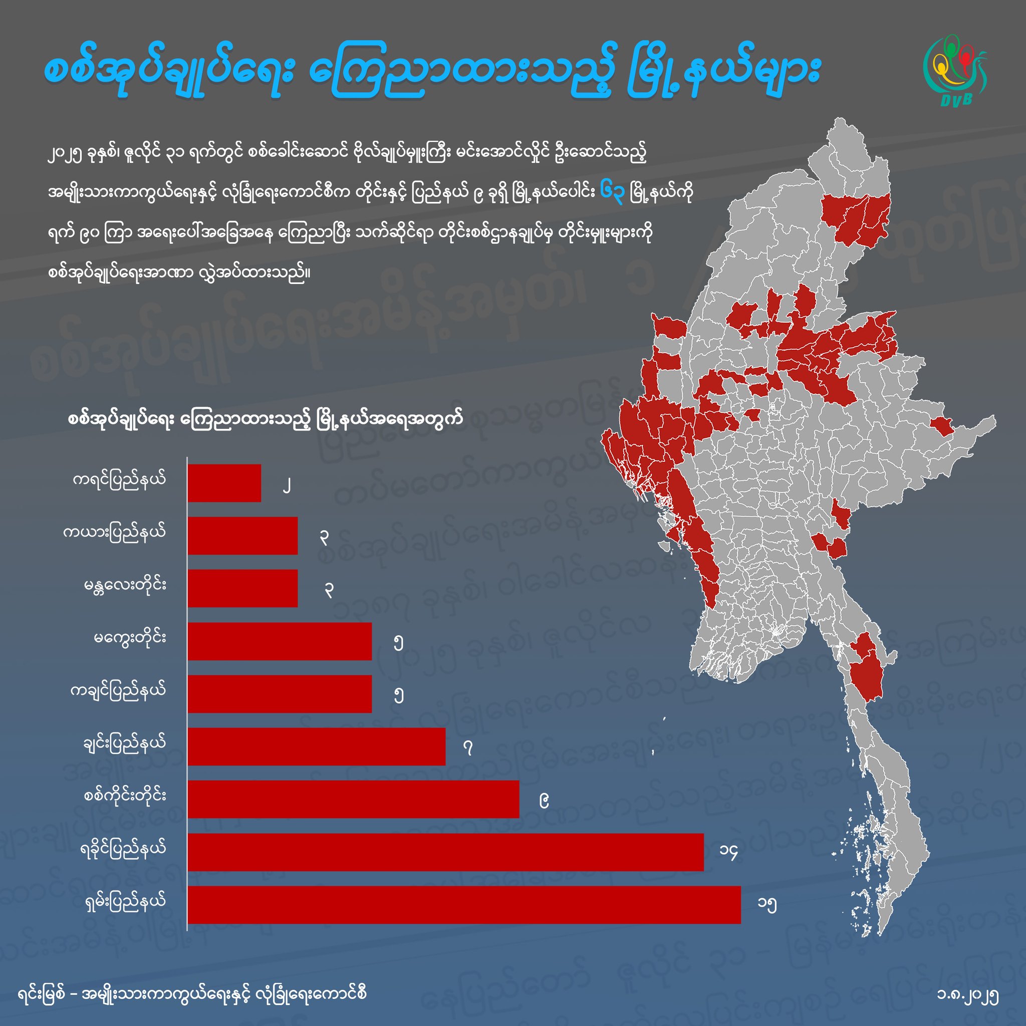 မြို့နယ်ပေါင်း ၆၃ မြို့နယ်ကို စစ်အုပ်ချုပ်ရေး ဆက်လက်ကြေညာ
