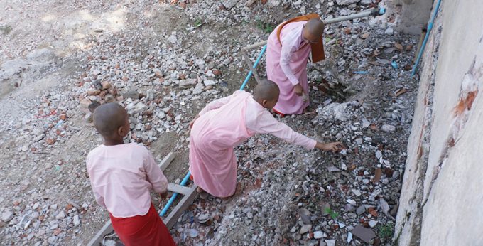 ငလျင်လှုပ်ပြီး ၂ လ အကြာမှာတော့ ပြိုကျပျက်စီးသွားတဲ့ သီလရှင်ကျောင်းတွေကို ပြန်လည်မတည်ဆောက်နိုင်သေးတာကြောင့် ကျန်ရစ်သူဆရာလေးအချို့ နေရပ်ပြန်ခဲ့ကြရပါတယ်။ အိမ်ပြန်စရာမရှိတဲ့ မိဘမဲ့ သီလရှင်ငယ်လေးတချို့နဲ့ ဆရာလေးသီလစာရီကတော့ ငလျင်ဒဏ်သင့် အပျက်အစီးပုံတွေကြားမှာ ခနော်နီခနော်နဲ့ ဆောက်ထားတဲ့ ယာယီကျောင်းဆောင်တွေမှာ ဖြစ်သလို သီတင်းသုံးနေကြရပါတယ်။