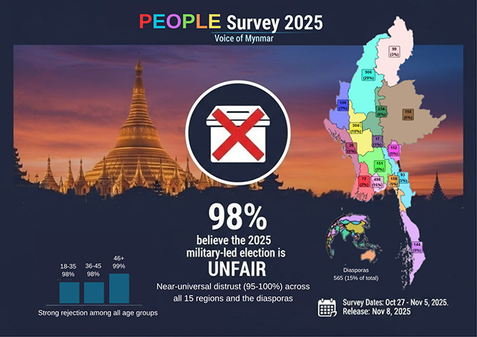 အာဏာသိမ်းစစ်တပ်ကလုပ်မယ့် ရွေးကောက်ပွဲနဲ့ပတ်သက်ပြီး စစ်တမ်းကောက်ယူရာမှာ ဖြေဆိုသူ ၉၉ ရာခိုင်နှုန်းက တရားမျှတမှုမရှိနိုင်ဘူးလို့ ယုံကြည်ကြောင်း ပြောခဲ့တယ်လို့ ပြည်သူ့လှုပ်ရှားမှုပလက်ဖောင်း (Platform for People Movement) က နိုဝင်ဘာ ၈ ရက် ဒီနေ့ ထုတ်ပြန်ပါတယ်။