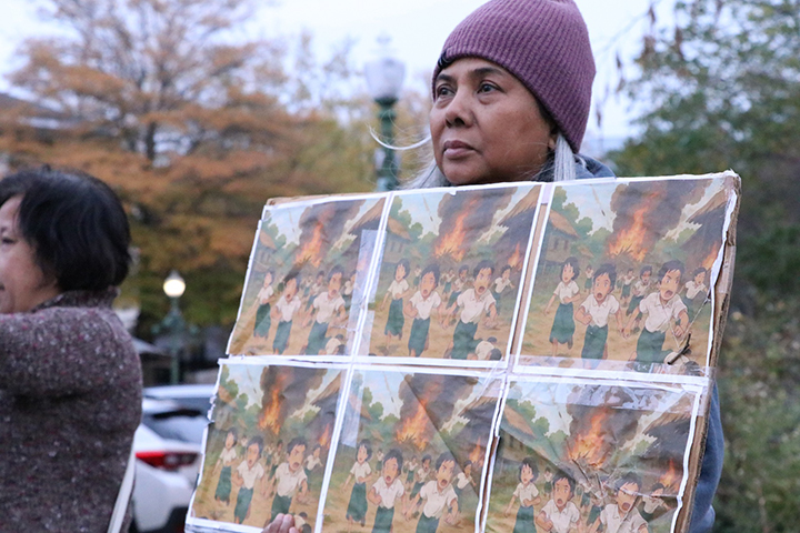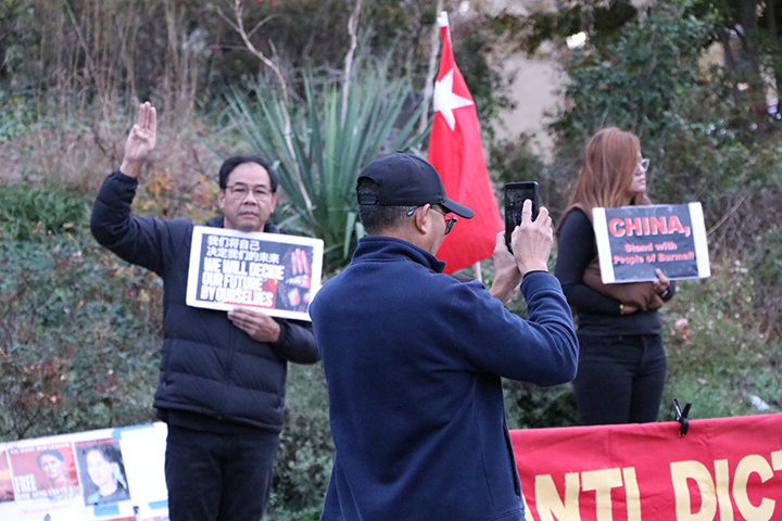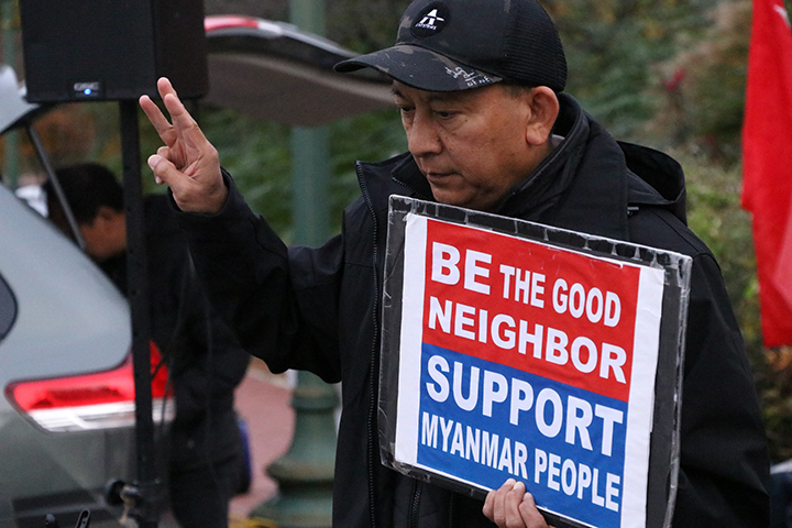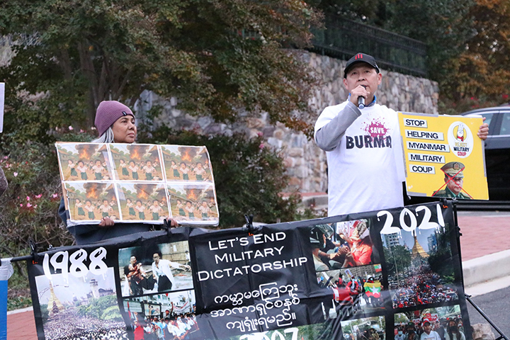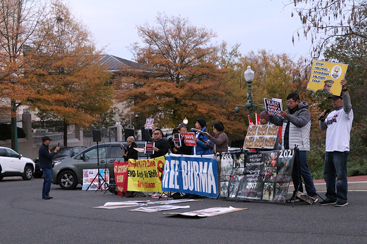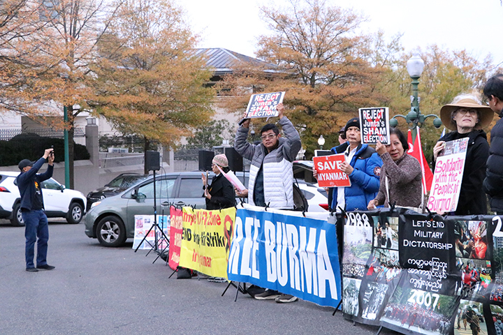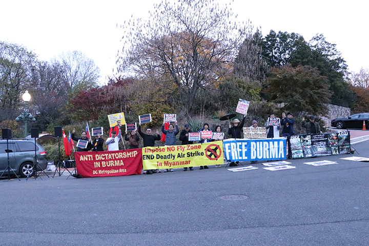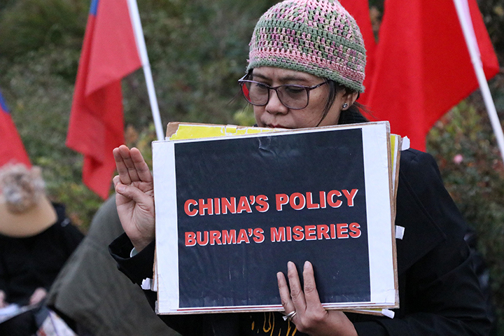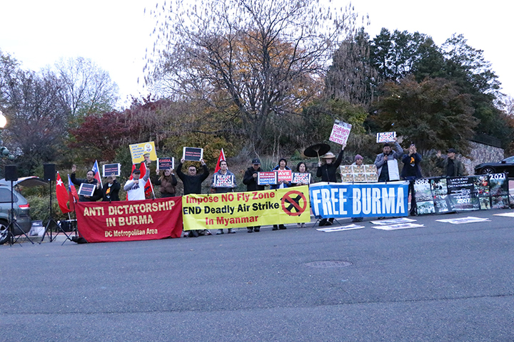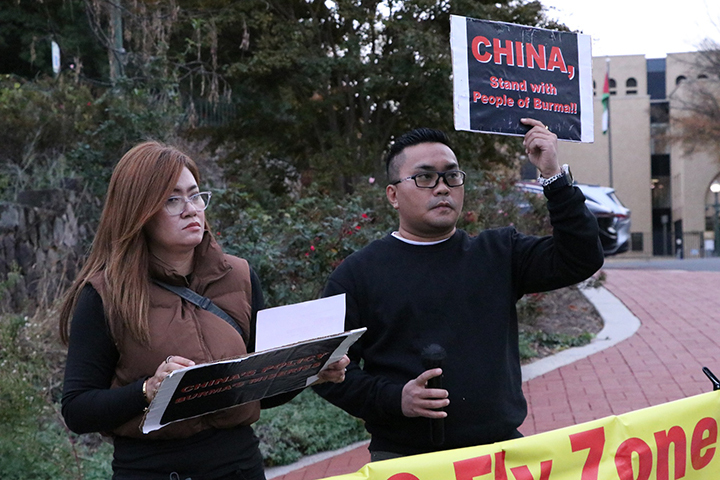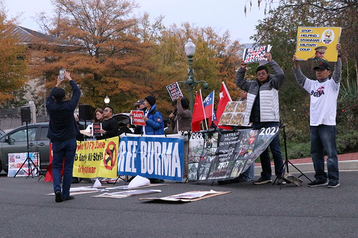 အာဏာသိမ်း စစ်ကောင်စီကို ထောက်ခံအားပေးနေတဲ့ တရုတ်အစိုးရရဲ့ လုပ်ရပ်တွေကို ရပ်တန်းကရပ်ဖို့ ဒေသစံတော်ချိန် နိုဝင်ဘာ ၇ ရက် မွန်းလွဲပိုင်းက အမေရိကန်ပြည်ထောင်စု၊ မြို့တော်ဝါရှင် တန်ဒီစီရှိ တရုတ်သံရုံးရှေ့မှာ မြန်မာ့အရေးတက်ကြွလှုပ်ရှားသူတွေက ဆန္ဒပြခဲ့ကြ တာပါ။
