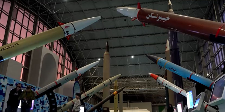 ဗီဒီယိုမှတ်တမ်းထဲမှာ ဒုံးကျည်တွေ၊ ဒရုန်းတွေနဲ့ တခြား စစ်ဘက်ဆိုင်ရာပစ္စည်းတွေကို အစ္စလာမ္မစ် တော်လှန်ရေးအစောင့်တပ် (IRGC) ရဲ့ အာကာသတပ်ဖွဲ့ပြတိုက်မှာ ပြသထားပါတယ်။