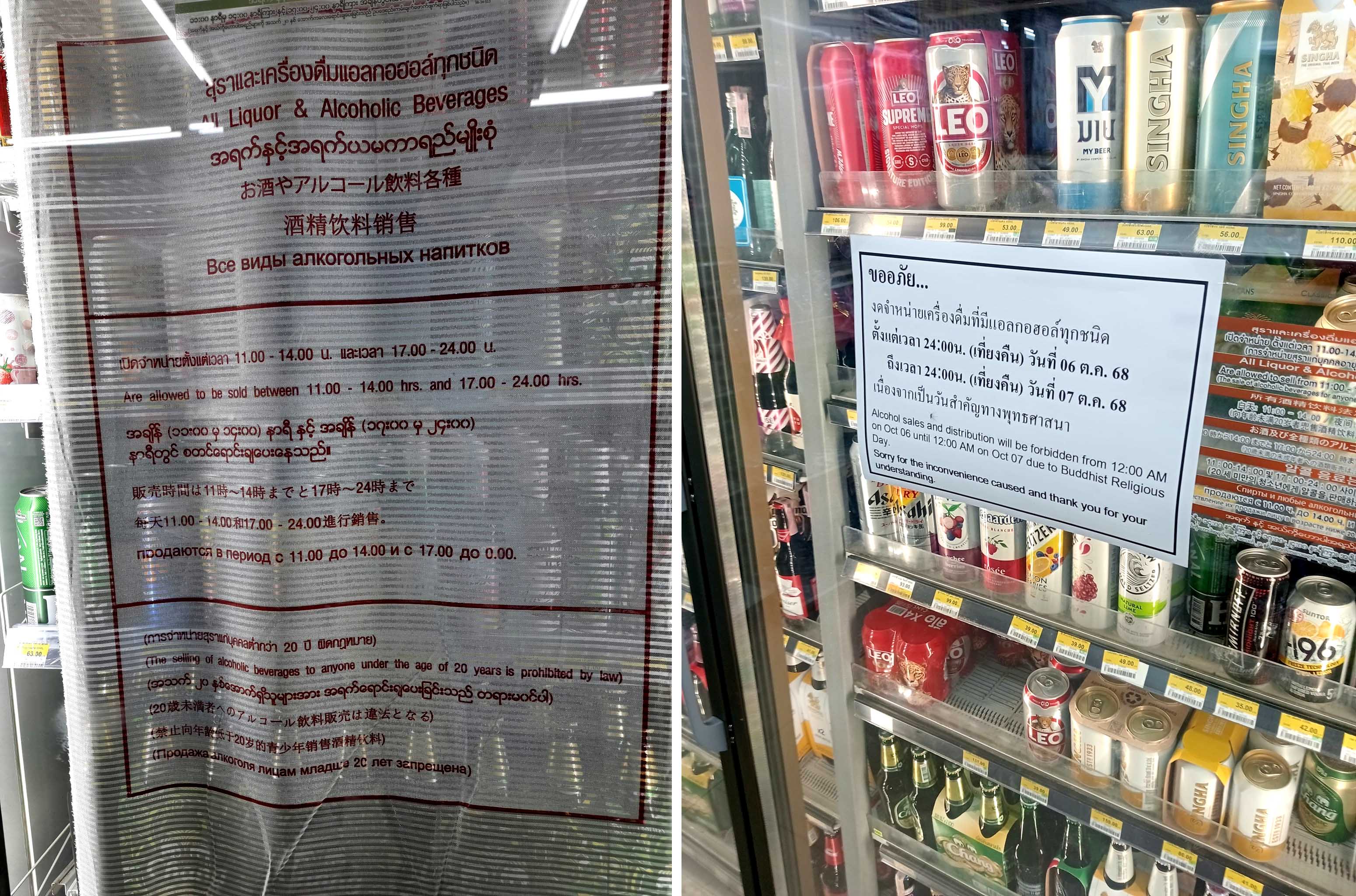 အထူးသဖြင့် ထိုင်းက ဈေးဝယ်စင်တာတွေ၊ ရပ်ကွက်ဈေးဆိုင်တွေနဲ့ 7-11 အရောင်းဆိုင်တွေမှာ အရက်၊ ဘီယာ ရောင်းချတာကို နေ့လယ် ၂ နာရီကနေ ညနေ ၅ နာရီအတွင်း ကန့်သတ်ထားပြီး ဒီဥပဒေက ၁၉၇၂ ခုနှစ်ကတည်းက ရှိခဲ့တာပါ။