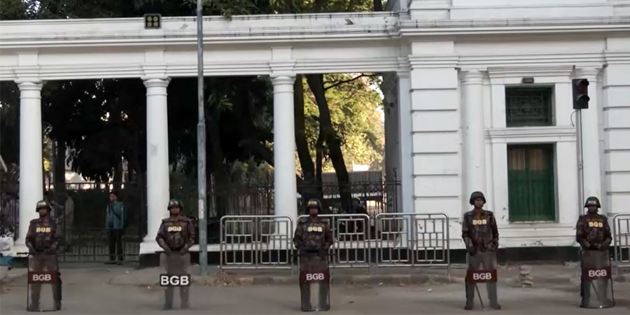ရာထူးကနေ ဖယ်ရှားခံရတဲ့ ဘင်္ဂလားဒေ့ရှ်ဝန်ကြီးချုပ် ရှိတ်ခ်ဟာစီနာအတွက် တရားရုံးစီရင်ချက် မတိုင်မီ နိုဝင်ဘာ ၁၇ ရက်မှာ ဘင်္ဂလားဒေ့ရှ်နိုင်ငံရဲ့ ပြည်တွင်း စစ်ရာဇဝတ်မှု တရားရုံးဖြစ်တဲ့ နိုင်ငံတကာ ရာဇဝတ်မှုခုံရုံးရဲ့ အပြင်ဘက်မှာ လုံခြုံရေး တိုးမြှင့်ထားပါတယ်။