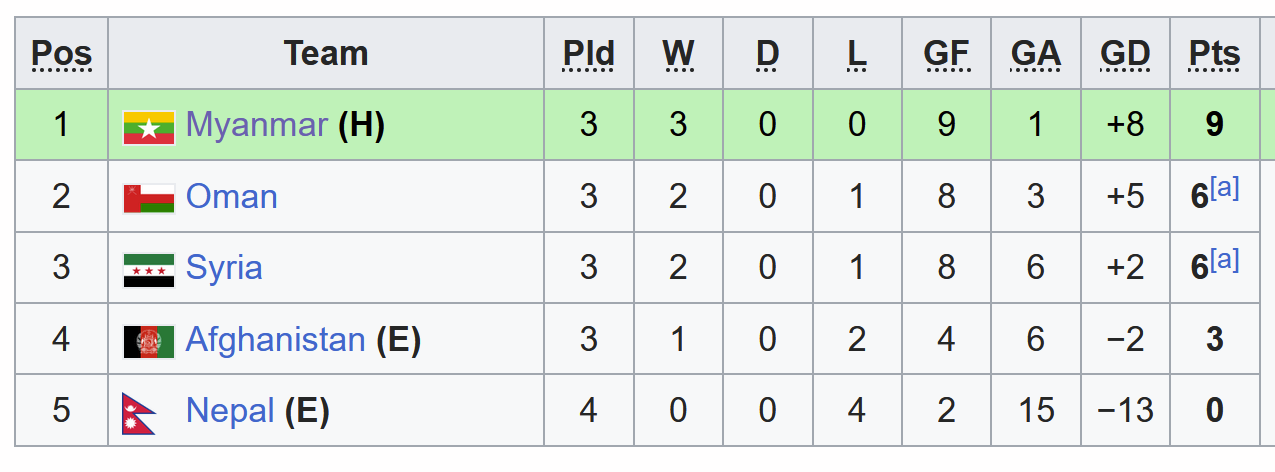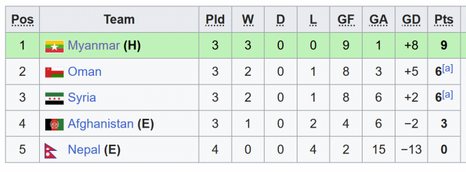 တရက်တည်းမှာပဲ ယှဉ်ပြိုင်ကစားခဲ့တဲ့ အာဖဂန်နစ္စတန်နဲ့ နီပေါတို့ ပွဲမှာတော့ အာဖဂန်နစ္စတန်အသင်းက (၂-၀) ဂိုးနဲ့ အနိုင်ရသွားပေမဲ့ ၂ သင်းစလုံး ခြေစစ်ပွဲမအောင်နိုင်တော့ ပါဘူး။