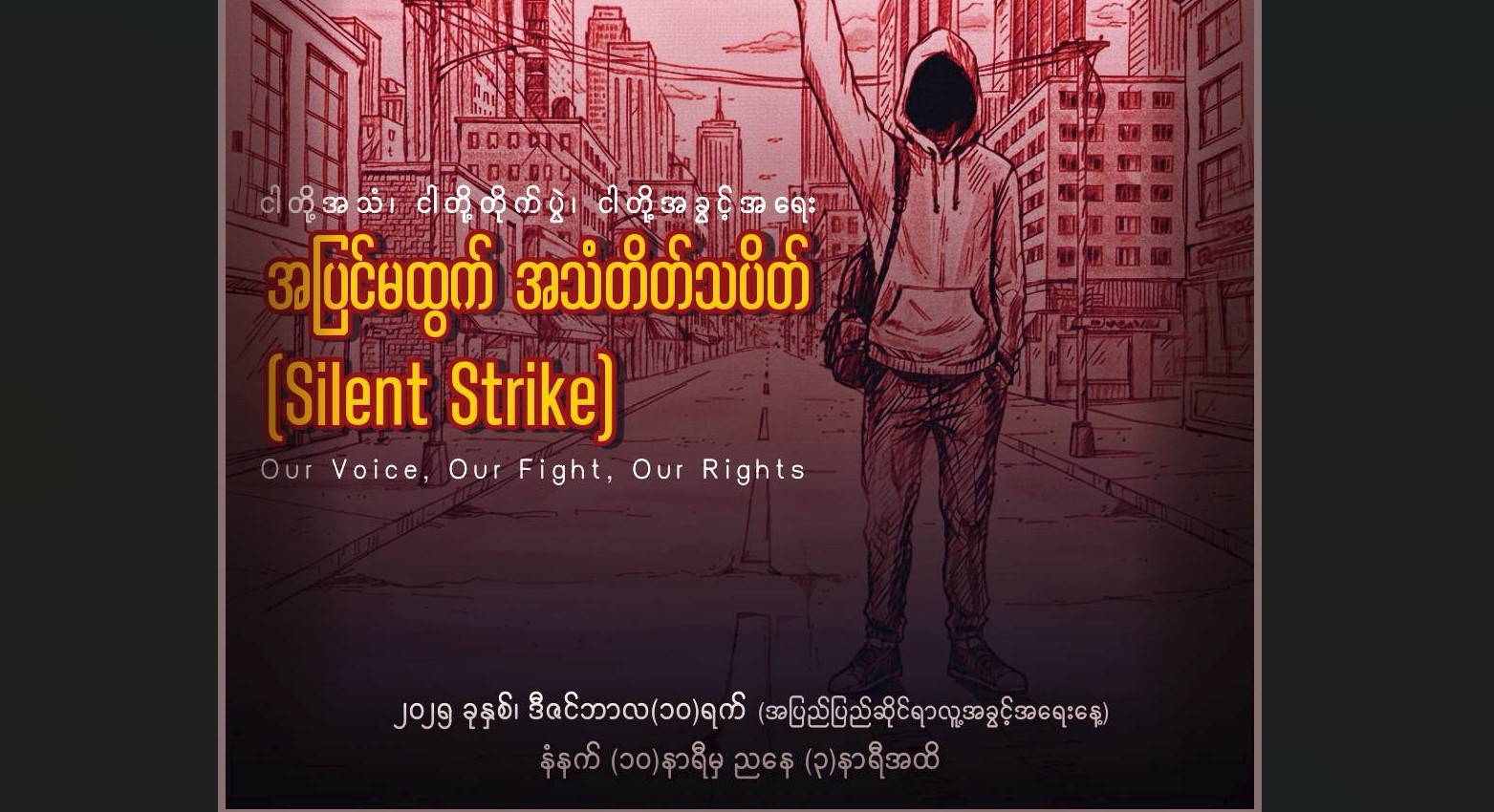 “ဓားထောက်ပြီး ဘုရင်မြှောက်ခိုင်းချိန်မှာ မတရားခံရကြောင်းကိုတော့ ကျနော်တို့ ဟစ်အော် အသိပေးကြပါမယ်။ ဒီလို အသိပေးဖို့အတွက် တိတ်ဆိတ်ခြင်းဟာ အကျယ်လောင်ဆုံး ဟစ်ကြွေးသံပါ။ အရင်လုပ်ခဲ့တဲ့နည်းတူ ဒီတခါမှာလည်း တိတ်ဆိတ်ခြင်းနဲ့ ကျနော်တို့ အသံကို ထုတ်ဖော်ပြသပါမယ်။ “Our Voice, Our Fight, Our Rights” ဆိုတဲ့ ဒီတခါ အသံတိတ် သပိတ် ဆောင်ပုဒ်အတိုင်း ကျနော်တို့ အခွင့်အရေးတွေအတွက် ကျနော်တို့ အသံတွေကိုတိတ်ကာ ဟစ်ကြွေးလို့ တိုက်ပွဲဝင်ကြမယ်”လို့ သပိတ်အင်အားစုက ထုတ်ပြန် ပြောပါတယ်။