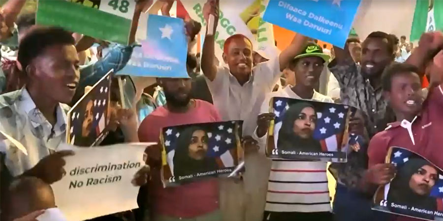 ဆန္ဒပြသူတွေက ဆိုင်းဘုတ်တွေကို ဝှေ့ယမ်းရင်း ဆိုမာလီ-အမေရိကန် လွှတ်တော်အမတ် အီဟန် အိုမာရဲ့ ဓာတ်ပုံတွေကို ကိုင်ဆောင်ရင်း အမျိုးသားရေးဂုဏ်သိက္ခာကို ကာကွယ်တဲ့ ကြွေးကြော်သံတွေကို ဟစ်ကြွေးခဲ့ကြပါတယ်။