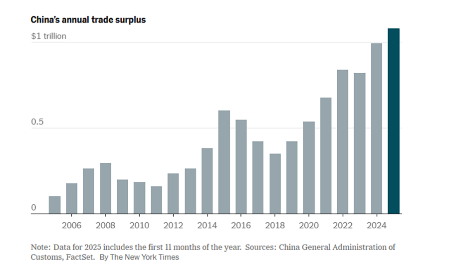 အမေရိကန်သမ္မတ ဒေါ်နယ်ထရမ့်ပ်ရဲ့ စည်းကြပ်ခွန်တွေက တရုတ်ရဲ့ ကမ္ဘာ့ပို့ကုန်အရှိန်အဟုန်ကို မဟန့်တားနိုင်ခဲ့ဘဲ အခုနှစ် ၁၁ လအတွင်းမှာ ကုန်သွယ်ရေးပိုငွေ ဒေါ်လာ ၁ ထရီလျံကျော်သွားပြီလို့ တရားဝင် ထုတ်ပြန်လိုက်ပါတယ်။