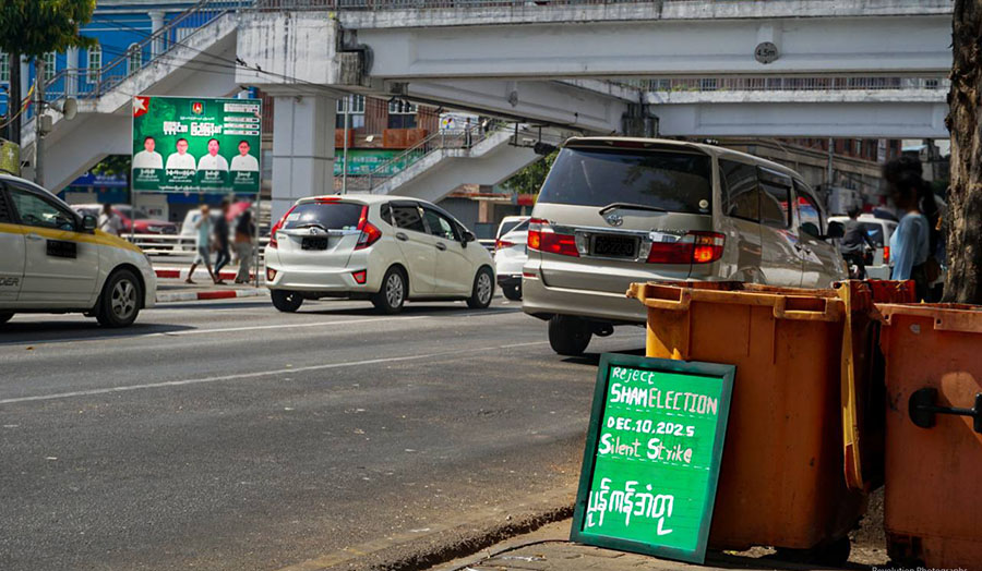 မြို့လယ်ခေါင်လှုပ်ရှားမှုနဲ့ ပတ်သက်လို့ ရန်ကုန်လူထုသပိတ်ရဲ့ ပြောရေးဆိုခွင့်ရှိသူ ရဲဘော် Libera က “လက်ရှိ ရန်ကုန်မှာ အကြမ်းဖက်စစ်ကောင်စီရဲ့ 360 CCTV တွေ၊ အသွင်ယူ ထောက်လှမ်းရေး အရပ်ဝတ်တွေ၊ ပုံမှန်ပတ်ကင်းတွေနဲ့ လုံခြုံရေးအထပ်ထပ်ချထားတဲ့ ကြားကနေ အခုလို မြို့လယ်ကောင်လို နေရာမျိုးမှာ အန္တရာယ်များကြားကနေ ဒီလှုပ်ရှားမှုကို ပြုလုပ်ခဲ့ရခြင်း ဖြစ်ပါတယ်။ အတုအယောင်ရွေးကောက်ပွဲ ဆန့်ကျင်ကြောင်း ဒီလှုပ်ရှားမှုနဲ့အတူ ရန်ကုန်မြို့နေ ပြည်သူတွေ အနေနဲ့လည်း မနက်ဖြန် ဒီဇင်ဘာ ၁၀ ရက်မှာ တနိုင်ငံလုံး အတိုင်းအတာနဲ့ ပြုလုပ်မဲ့ Silent Strike မှာ ပါဝင်ကြဖို့ အလေးအနက် တိုက်တွန်းလိုပါတယ်” လို့ DVB ကို ပြောပါတယ်။သရုပ်ဖော်ဓာတ်ပုံထဲမှာတော့ “အမှိုက်ပုံးအနီး အတုအယောင်ရွေးကောက်ပွဲကို ဆန့်ကျင်ကြောင်းနဲ့ အသံတိတ်သပိတ်နေ့ကို သတိပေးထားပြီး ပုန်ကန်အံတု စာသားပါ ဆိုင်းဘုတ်ကို ထောင်ထားတာဖြစ်ပါတယ်။ အမှိုက်ပုံက အတုအယောင်ရွေးကောက်ပွဲရဲ့ ‘မဲပုံး’ တွေကို ရည်ရွယ်ခြင်းဖြစ်ကြောင်း” ရန်ကုန်လူထုသပိတ်က ထုတ်ပြန်ပါတယ်။