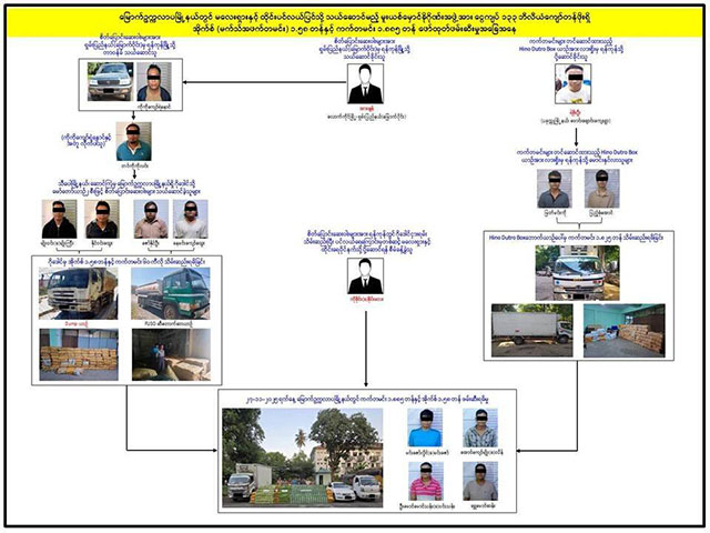ကွင်းဆက်ဖော်ထုတ်ချက်အရ ရှမ်းပြည်နယ်မြောက်ပိုင်း၊ လားရှိုးကနေ မူးယစ်ဆေးတွေ သယ်ဆောင်ခဲ့ပြီး တဆင့်လွှဲပြောင်းပေးခဲ့တဲ့ မြတ်မင်းကိုနဲ့ ပြည့်စုံအောင်တို့ကို နိုဝင်ဘာ ၂၇ ရက်က မင်္ဂလာဒုံမြို့နယ်၊ နွယ်ခွေရပ်ကွက်က တည်းခိုခန်းမှာ၊ ရှမ်းပြည်နယ်မြောက်ပိုင်း၊ မိုင်းရယ်ကနေ ရွှေပေါက္ကံမြို့သစ်က ဂိုဒေါင်ထဲကို မူးယစ်ဆေးတွေသယ်ဆောင်ခဲ့တဲ့ ဇော်နိုင်ဦးနဲ့ နေမင်းကျော်ထွေးတို့ကို နိုဝင်ဘာ ၂၈ ရက်က Mitsubishi Fuso ဆီဘောက်ဆာကား ၁ စီးနဲ့အတူ ကျောက်ဆည်မြို့နယ်၊ သံရွာနားမှာ ဖမ်းမိခဲ့တယ်လို့ ဆိုပါတယ်။