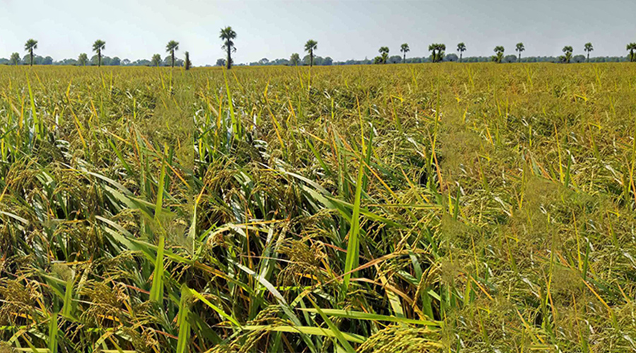 အခုနှစ် မိုးရာသီက စိုက်ပျိုးခဲ့တဲ့ ရွှေဘို(ပေါ်ဆန်းမွှေး) ဘေးကြားစပါးခင်းတွေကို ဒီဇင်ဘာလထဲမှာ ရိတ်သိမ်းချိန်ကျနေပေမဲ့ ရာသီဥတုဖောက်ပြန်ပြီး ဖြုတ်ပိုးကျကာ သွင်းအားစု ပိုးသတ်ဆေးနဲ့ ဓာတ်မြေသြဇာစျေး မြင့်တက်မှုတို့ကြောင့် လယ်တဧကမှာ စပါးတင်း ၇၀ မှ ၈၀ ထွက်ရှိသူဟာ အလွန်နည်းပါးပြီး စပါးတင်း ၃၅ တင်းမှ ၅၀ တင်း ထွက်ရှိ လယ်ဧက က များတယ်လို့ သိရပါတယ်။