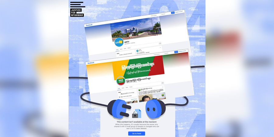 စစ်အုပ်စုဘက်က ဝါဒဖြန့်ဖို့ အသစ်ထပ်ဖွင့်ထားတဲ့ MRTV စာမျက်နှာနဲ့ MRTV ပို့စ်တွေကို ပြန်လည်ကူးတင်ဖြန့်ဝေတဲ့ MRN စာမျက်နှာတို့ကို ဖေ့စ်ဘွတ်ခ်က ဖယ်ရှား ပိတ်သိမ်းလိုက်တယ်လို့ Justice For Myanmar က ဒီဇင်ဘာ ၂၃ ရက်မှာ ထုတ်ပြန်ပါတယ်။