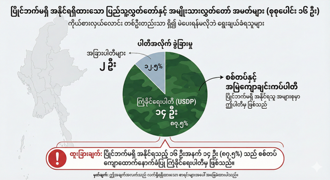 အဲဒီထဲမှာ ၁၄ ဦးကတော့ စစ်တပ်နဲ့ အမြဲတမ်း ကျောချင်းကပ်တဲ့ ကြံ့ခိုင်ရေးပါတီက ဖြစ်ပါတယ်။ အပိုင်း (၃) ပြီးမှ လွှတ်တော်အမတ် အများဆုံး ၅၈၉ ယောက်ပဲ ရှိမှာ ဖြစ်ပါတယ်။ အခြေခံဥပဒေပါအတိုင်း ၆၆၄ ယောက်တော့ ပြည့်မှာ မဟုတ်ပါဘူး။ တပ်မတော်သား လွှတ်တော်ကိုယ်စားလှယ်ကတော့ လုံးဝ အလုံးအရင်း မလျော့ဘဲ ၁၆၆ ယောက် ရှိနေမှာ ဖြစ်ပါတယ်။ စစ်တပ်ရဲ့ပါတီဖြစ်တဲ့ ကြံ့ခိုင်ရေးက မပြိုင်ဘဲ နိုင်ထားတဲ့ လူကလည်း ၁၄ ယောက် ရှိပြီးသား။ ဒီနှစ်စုပေါင်းလိုက်ရင်ပဲ ၁၈၀ ရှိနေပါပြီ။ ဒီအတွက် ၂၉၅ ပြည့်ဖို့အတွက် နောက်ထပ် ၁၁၅ ပဲ လိုတာကို ဒီမှာ တွေ့နိုင်ပါတယ်။