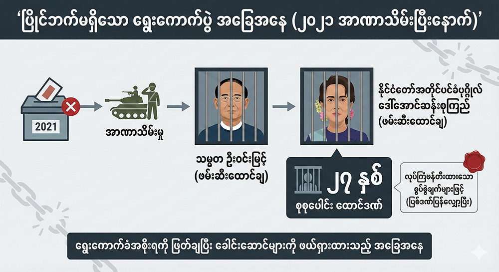 ပထမဆုံးအနေနဲ့ ဒါဟာ ပြိုင်ဘက်မရှိတဲ့ ရွေးကောက်ပွဲပါ။ ၂၀၂၁ ခုနှစ် အာဏာသိမ်းပြီးကတည်းက စစ်တပ်ဟာ ရွေးကောက်ခံအစိုးရကို ဖြုတ်ချပြီးတော့ သမ္မတ ဦးဝင်းမြင့်နဲ့ နိုင်ငံတော်ရဲ့ အတိုင်ပင်ခံပုဂ္ဂိုလ် ဒေါ်အောင်ဆန်းစုကြည်တို့ကို ဖမ်းဆီး ထောင်ချခဲ့ပါတယ်။ ဒေါ်အောင်ဆန်းစုကြည် ဆိုရင် လုပ်ကြံဖန်တီးထားတဲ့ စွပ်စွဲချက်တွေနဲ့ ပြစ်ဒဏ် လျှော့ပေးထားတယ် ဆိုတာတောင် ထောင်ဒဏ် ၂၇ နှစ်အထိ ချမှတ်ခံထားရပါတယ်။ ဒါတင်မကပါဘူး၊ အာဏာသိမ်းပြီးစမှာ ဝန်ကြီးတွေ၊ လွှတ်တော်အမတ်တွေနဲ့ ရွေးကောက်ပွဲကော်မရှင် တာဝန်ရှိသူတွေ အပါအဝင် ၁၉၇ ဦးထက်မနည်း ဖမ်းဆီး ထိန်းသိမ်းခဲ့ပါတယ်။ နိုင်ငံရေးသမားတွေ၊ တက်ကြွလှုပ်ရှားသူတွေနဲ့ ဆန္ဒပြသူတွေ အပါအဝင် နိုင်ငံရေးအကျဉ်းသား ၃၀,၀၀၀ လောက်ကို ဖမ်းဆီးထားတယ်လို့ တွက်ချက်မှုတွေအရ သိရပါတယ်။