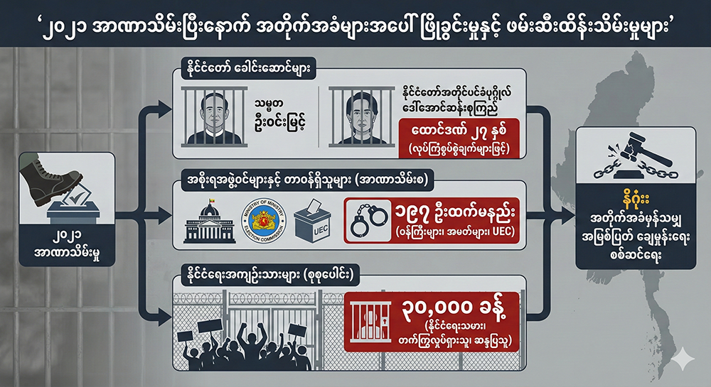 ဒါဟာ သာမန်ဖမ်းဆီးမှု မဟုတ်ပါဘူး။ အတိုက်အခံ မှန်သမျှကို အမြစ်ပြတ် ချေမှုန်းနေတဲ့ စစ်ဆင်ရေးကြီးတခု ဖြစ်ပါတယ်။ လူထုထောက်ခံမှု အများဆုံးရထားတဲ့ အမျိုးသား ဒီမိုကရေစီအဖွဲ့ချုပ် (NLD) ပါတီကိုလည်း ၂၀၂၃ ခုနှစ်မှာ နိုင်ငံရေးပါတီများ မှတ်ပုံတင်ခြင်း ဥပဒေ အသစ်နဲ့ ဖျက်သိမ်းလိုက်ပါပြီ။ NLD အပါအဝင် ပါတီပေါင်း ၄၀ ကျော် ဖျက်သိမ်းခံလိုက်ရပါတယ်။ အမျိုးသားညီညွတ်ရေးအစိုးရ (NUG) ကိုတော့ အကြမ်းဖက် အဖွဲ့အစည်းအဖြစ် တံဆိပ်ကပ်ထားပါတယ်။ ဒီရွေးကောက်ပွဲမှာ ပြည်သူတွေ မဲပေးချင်တဲ့လူတွေက ထောင်ထဲရောက်နေတယ်၊ ဒါမှမဟုတ် တောထဲရောက်နေပါတယ်။ စစ်တပ်နဲ့ ကျောချင်းကပ်ဖို့ လိုတယ်လို့ တရားဝင်ပြောထားတဲ့ ကြံ့ခိုင်ရေးပါတီနဲ့ ပါတီ အနည်းစုလောက်ပဲ ဝင်ပြိုင်ဖို့ မဲဆွယ်နေကြတာ ဖြစ်ပါတယ်။