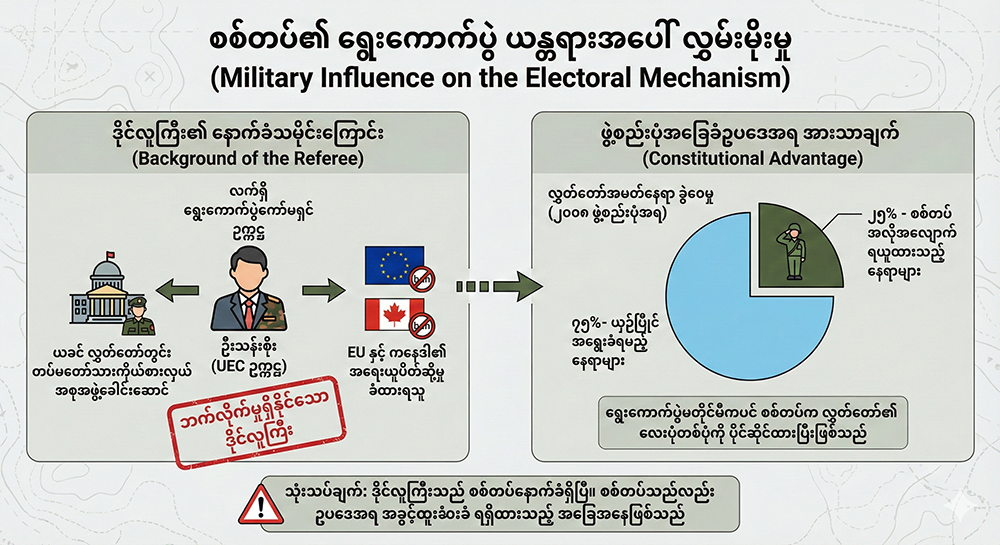 ဒုတိယအချက်ကတော့ ဒိုင်လူကြီးဖြစ်တဲ့ ပြည်ထောင်စုရွေးကောက်ပွဲကော်မရှင် (UEC) ဥက္ကဋ္ဌ ဦးသိန်းစိုး ဆိုတာဟာ လွှတ်တော်ထဲက တပ်မတော်သားကိုယ်စားလှယ် အစုအဖွဲ့ကို ဦးဆောင်ခဲ့သူ ဖြစ်ပါတယ်။ ဥရောပသမဂ္ဂ (EU) နဲ့ ကနေဒါရဲ့ အရေးယူပိတ်ဆို့မှု ခံထားရသူလည်း ဖြစ်ပါတယ်။ ၂၀၀၈ ဖွဲ့စည်းပုံ အခြေခံဥပဒေအရ စစ်တပ်က လွှတ်တော် အမတ်နေရာ ၂၅ ရာခိုင်နှုန်းကို အလိုအလျောက် ရယူထားပြီးလည်း ဖြစ်ပါတယ်။