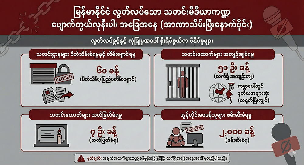 တတိယအချက်ကတော့ မျက်စိပိတ် နားပိတ် လုပ်ထားတာပါ။ လွတ်လပ်တဲ့ သတင်းမီဒီယာ ကဏ္ဍဟာ မြန်မာပြည်တွင်းမှာ ပျောက်ကွယ်လုနီးပါး ဖြစ်နေပါပြီ။ အာဏာသိမ်းပြီးတဲ့ နောက်ပိုင်း သတင်းဌာန ၆၀ လောက် ပိတ်သိမ်းခံရတာ၊ ပြည်ပကို တိမ်းရှောင်ရတာတွေ ရှိခဲ့ပါတယ်။ သတင်းထောက် ၁၇၆ ဦး ဖမ်းဆီးခံခဲ့ရပြီး သတင်းထောက် ၅၁ ဦးလောက် လက်ရှိ အကျဉ်းချခံထားရပြီးတော့ သတင်းထောက် ၇ ဦးလောက် သတ်ဖြတ်ခံခဲ့ရပါတယ်။ မြန်မာနိုင်ငံဟာ တရုတ်ပြီးရင် ကမ္ဘာပေါ်မှာ သတင်းထောက်တွေကို ဒုတိယအများဆုံး ဖမ်းဆီးတဲ့နိုင်ငံ ဖြစ်လာပါတယ်။ အွန်လိုင်းပေါ်က စစ်ကောင်စီကို ဝေဖန်သူ ၂,၀၀၀ လောက် ဖမ်းဆီးခံခဲ့ရပါတယ်။ နောက်ထပ် အဆိုးရွားဆုံးကတော့ ရွေးကောက်ပွဲကာကွယ်ရေး ဥပဒေတရပ် ပြဋ္ဌာန်းပြီးတော့ ဖိနှိပ်တဲ့ကိစ္စ ဖြစ်ပါတယ်။ ရွေးကောက်ပွဲကို နှောင့်ယှက်ရင်၊ ဆန့်ကျင်ရင် အကြမ်းဖက်မှုလို့ သတ်မှတ်ပြီးတော့ ထောင်ဒဏ် တသက်တကျွန်းကနေ သေဒဏ်အထိ ပေးနိုင်တဲ့ ဥပဒေတွေ၊ အမိန့်တွေ ထုတ်ပြန်ထားပါတယ်။ အဲဒီဥပဒေအရ အမှုဖွင့် အရေးယူခံထားရတဲ့ ဦးရေဟာ ၃၀၀ ကျော် ရှိလာပြီ ဖြစ်ပါတယ်။