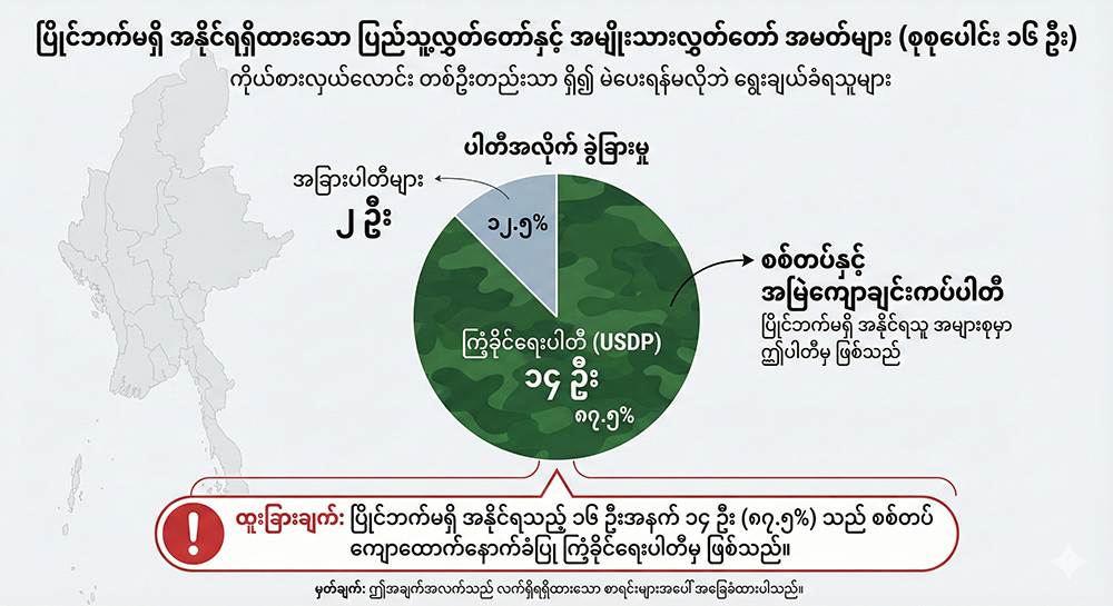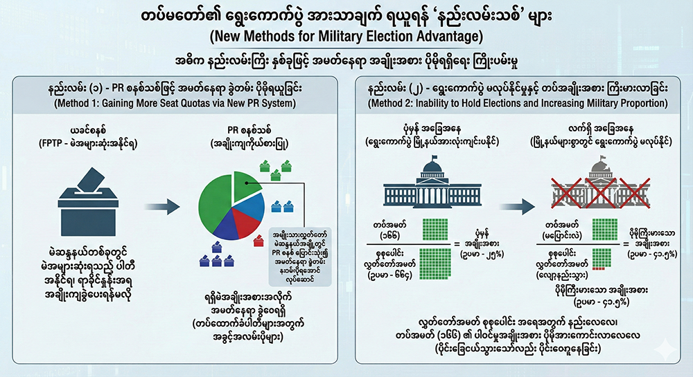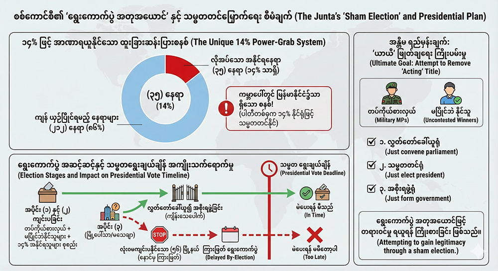 အာဏာသိမ်းစစ်တပ်က အပိုင်း ၃ ပိုင်းခွဲ ကျင်းပမဲ့ ရွေးကောက်ပွဲနဲ့ ပတ်သက်တဲ့ အငြင်းပွားစရာ ကိန်းဂဏန်းတွေကို တင်ပြသွားမှာ ဖြစ်ပါတယ်။ ဒီရွေးကောက်ပွဲဟာ ပြည်သူ့ဆန္ဒကို ဖော်ထုတ်ဖို့ လုပ်တဲ့ပွဲ မဟုတ်ပါဘူး။ မင်းအောင်လှိုင်ကို သူ့ဘာသာပေးထားတဲ့ “ယာယီ” ဆိုတဲ့ နာမဝိသေသနကို ဖြုတ်ပြီးတော့ သမ္မတစလွယ်ဆင်ပေးဖို့ လုပ်တဲ့၊ ကြံ့ခိုင်ရေးပါတီက အမတ် ၃၅ နေရာလောက် နိုင်ရုံနဲ့ အစိုးရဖွဲ့သွားနိုင်မယ့် လုပ်ပွဲဖြစ်ပါတယ်။ တိုင်းပြည်ကို မတရား သိမ်းပိုက်ထားသူတယောက် ဥပဒေနဲ့ညီသယောင် အတည်ပြုချက် ယူချင်ရုံသက်သက်လုပ်တဲ့ လုပ်ပွဲ ဖြစ်တယ်ဆိုတာ အချက်အလက်တွေအရ တွက်ချက် ဆန်းစစ်သွားမှာ ဖြစ်ပါတယ်။