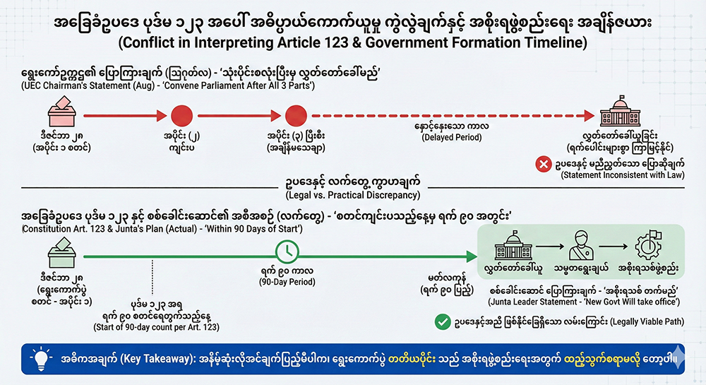ရွေးကောက်ပွဲဥပဒေ ပုဒ်မ ၁၂၃ အရ အပိုင်း ၃ ပိုင်းစလုံး ကျင်းပပြီးမှ လွှတ်တော်ခေါ်မယ်လို့ ဩဂုတ်လတုန်းက ပြောထားပါတယ်။ ဒါပေမဲ့ အဲဒီ ပုဒ်မ ၁၂၃ မှာ ရေးထားတာက...