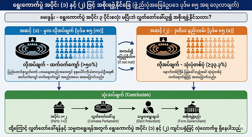 အနိမ့်ဆုံးလိုအပ်ချက် ပြည့်ဖို့ ဒုတိယပိုင်းလောက်နဲ့တင် လုံလောက်နေပြီ ဖြစ်ပါတယ်။ ပထမပိုင်းနဲ့ ဒုတိယပိုင်းပဲ ကျင်းပပြီးတော့ လွှတ်တော်ခေါ်ပြီးတော့ အစိုးရဖွဲ့ရင် မရနိုင်ဘူးလား ဆိုတဲ့ အချက်ကို အရင်ဆုံး ကြည့်ဖို့လိုပါတယ်။ အခြေခံဥပဒေ ပုဒ်မ ၈၅ (က) ကို ကြည့်ရအောင်ပါ။ ပြည်ထောင်စုလွှတ်တော် အစည်းအဝေးတရပ်ရဲ့ ပထမနေ့မှာ အစည်းအဝေးကို တက်ရောက်ခွင့် ရှိတဲ့ လွှတ်တော်ကိုယ်စားလှယ် စုစုပေါင်းရဲ့ ထက်ဝက်ကျော်ဦးရေ တက်ရောက်လို့ရှိရင် အစည်းအဝေး အထမြောက်သည်လို့ ရေးထားပါတယ်။ အကယ်၍ ထက်ဝက်ကျော် မပြည့်လို့ နောက်ရက်ရွှေ့ရမယ် ဆိုရင်လည်း နောက်တကြိမ် ခေါ်တဲ့အခါ ၃ ပုံ ၁ ပုံ ရှိရုံနဲ့ လုံလောက်တယ်လို့ ၈၅ (ခ) မှာ ဆက်ရေးထားပါတယ်။