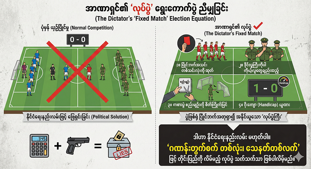 ကိန်းဂဏန်း အရကိုက ဒီပုစ္ဆာဟာ ရှင်းနေပါတယ်။ ပြိုင်ဘက်အသင်းကို တခါမှ နိုင်အောင် မကန်နိုင်တဲ့ အခါကျတော့ နံပါတ် (၁) ပြိုင်ဘက် တသင်းလုံးကို ထုတ်၊ နံပါတ် (၂) ဒိုင်လူကြီးကိုပါ ကိုယ့်လူတွေချည်း ထည့်၊ နံပါတ် (၃) ကစားကွင်းရဲ့ စည်းမျဉ်းကိုပါ စိတ်ကြိုက်ပြင်ပြီးတော့ နံပါတ် (၄) ဂိုးကျောလည်း ယူပြီးတော့ ပွဲဖြစ်ရုံ ပြိုင်ဘက်တွေ ရှာပြီးတော့ အသင်းဖွဲ့ပေး၊ လုပ်ပွဲကြီး ကန်ပြီးတော့ အနိုင်ယူဖို့ ကြိုးစားနေတာ သေချာပါတယ်။ ရွေးကောက်ပွဲဟာ နိုင်ငံရေးနည်းနဲ့ ဖြေရှင်းတာ လုံးဝ မဟုတ်ပါဘူး။ ဂဏန်းတွက်စက်တလုံး၊ သေနတ်တလက်နဲ့ တိုင်းပြည်ကို လိမ်ဖို့ ကြိုးစားတဲ့ အာဏာရှင်ရဲ့ လုပ်ပွဲသက်သက်သာ ဖြစ်ပါလိမ့်မယ်။