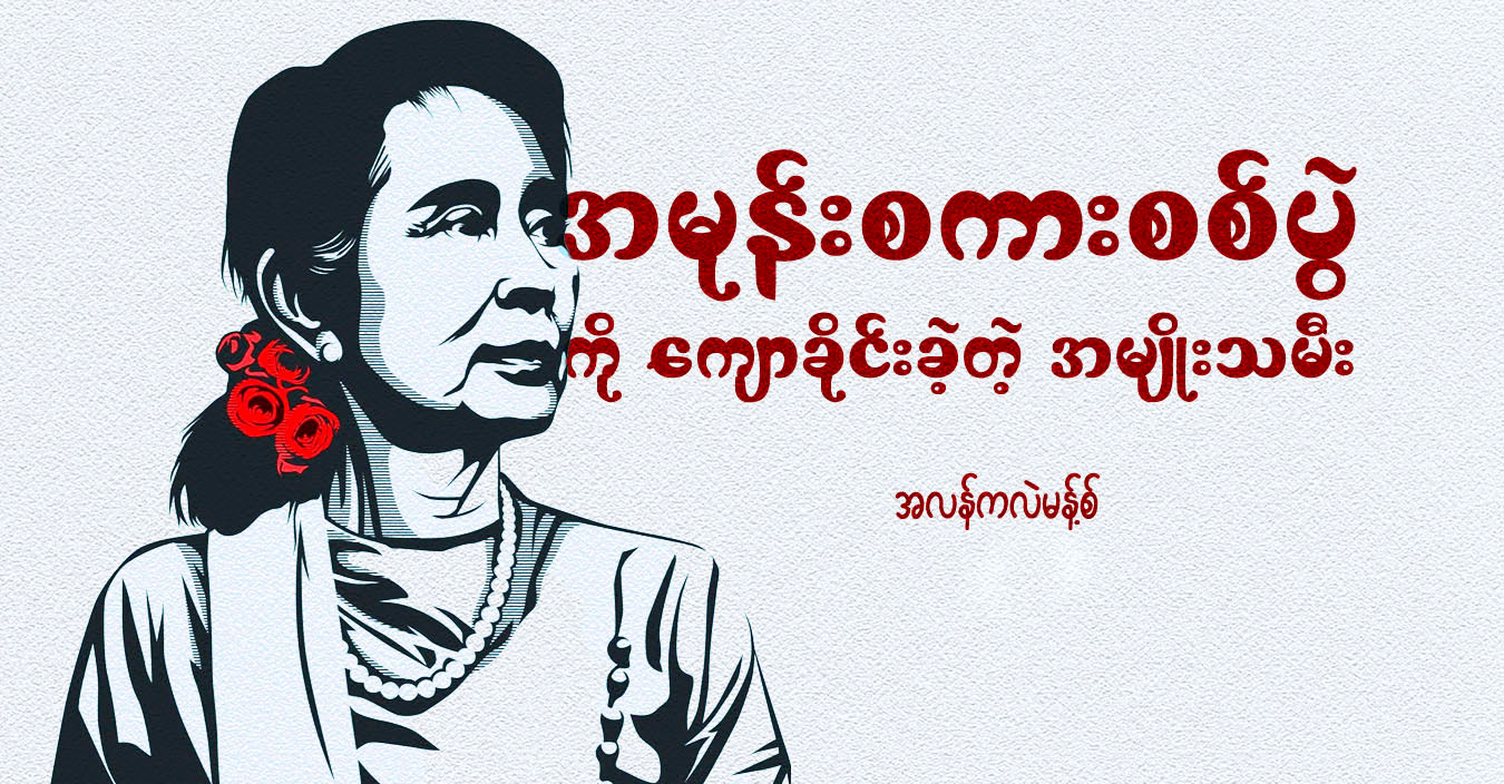 ဒေါ်အောင်ဆန်းစုကြည်က ဒါကို ကြီးမားတဲ့ ပေးဆပ်မှုတွေနဲ့ သက်သေပြခဲ့ပါတယ်။ လွတ်မြောက်မှုရဲ့ ပထမဆုံး ခြေလှမ်းဟာ ပါးစပ်ဖျားကနေ စတယ်ဆိုတာ သူ့ဘဝက သတိပေးနေပါတယ်။