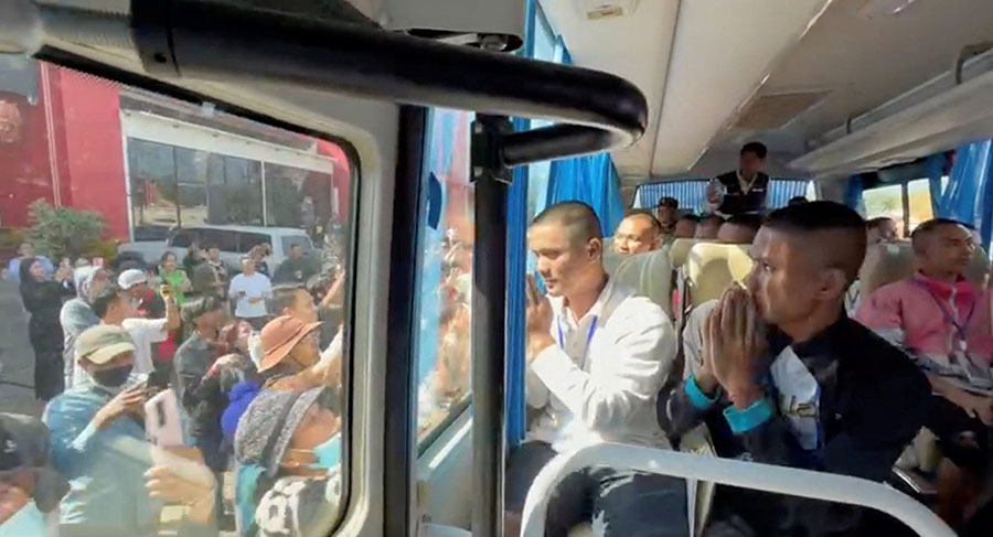ထိုင်းနဲ့ ကမ္ဘောဒီးယား အိမ်နီးချင်း ၂ နိုင်ငံတို့ သီတင်းပတ်ကုန်ရက်မှာ သဘောတူခဲ့တဲ့ အပစ်အခတ်ရပ်စဲရေး ပြန်စပြီးတဲ့နောက် ထိုင်းနိုင်ငံကနေ ပြန်လွတ်လာတဲ့ ကမ္ဘောဒီးယားစစ်သား ၁၈ ယောက်ကို တင်ဆောင်လာတဲ့ ယာဉ်တန်းဟာ နယ်စပ်ကို ဖြတ်ကျော်ဝင်ရောက်လာချိန်မှာ လူအုပ်ကြီးက ကမ္ဘောဒီးယားအလံတွေကို ဝှေ့ယမ်း ကြွေးကြော် ကြိုခဲ့ကြပါတယ်။