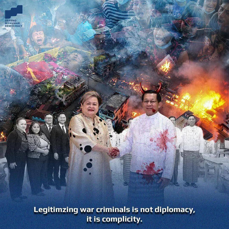ပြီးခဲ့တဲ့ ဇန်နဝါရီ ၁၄ ရက် ဖိလစ်ပိုင်နိုင်ငံခြားရေးဝန်ကြီး မစ္စမာရီယာ ထရက်ဆာ ပရဲညို လာဇာရိုရဲ့ နေပြည်တော်ခရီးစဉ်မှာ မြန်မာစစ်ခေါင်းဆောင်နဲ့ တွေ့ဆုံခဲ့တဲ့အပေါ် မြန်မာနဲ့ ဖိလစ်ပိုင်နိုင်ငံတို့မှာ ရှိတဲ့ အရပ်ဖက်အဖွဲ့အစည်း ၉၉ ဖွဲ့က ပြင်းထန်စွာရှုတ်ချကြောင်း ဇန်နဝါရီ ၁၅ ရက်နေ့မှာ ပူးတွဲထုတ်ပြန်ပါတယ်။