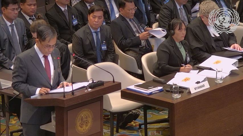 နယ်သာလန်နိုင်ငံ၊ သည်ဟိဂ်မြို့က အပြည်ပြည်ဆိုင်ရာတရားရုံး (ICJ) မှာ လူမျိုးတုံးသတ်ဖြတ်မှုနဲ့ ဂမ်ဘီယာနိုင်ငံကနေ စွပ်စွဲထားတဲ့ အမှုနဲ့ ပတ်သက်ပြီး ဇန်နဝါရီ ၁၆ ရက်မှာ စစ်ကောင်စီခန့် သမ္မတရုံးဝန်ကြီးဌာန-၂ ပြည်ထောင်စုဝန်ကြီး ဦးကိုကိုလှိုင်က ခုခံချေပ လျှောက်လဲရာမှာ ပြောဆိုခဲ့တာပါ။