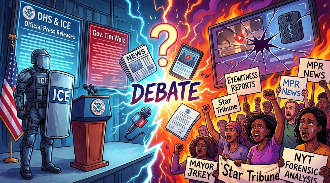 မင်နီဆိုတာပြည်နယ်က ICE ဖမ်းဆီးမှု အကြမ်းဖက်မှု ဖြစ်စဉ်တွေမှာ မီဒီယာတွေရဲ့ ဘောင်ခတ်ပုံဖော်မှု အမျိုးမျိုး ကွဲပြားနေသလို အွန်လိုင်းမှာ ပျံ့နှံ့ထပ်ထွက်ပေါ်လာနေတဲ့ မျက်မြင်သက်သေ ဗီဒီယိုဖိုင်တွေကို ပြန်ကြည့်သုံးသပ်ရာမှာလည်း အမြင်မတူကြတာတွေ ရှိပါတယ်။ အစိုးရပြောစကားနဲ့ ဒေသခံအမြင်ကွဲလွဲ နေတာတွေ Fox News ဦးစားပေးတင်ပြပုံနဲ့ တခြား ဒေသခံမီဒီယာတွေ တင်ပြပုံကွာခြားပုံကိုလည်း အလွယ်တကူတွေ့နိုင်ပါတယ်။ ဖယ်ဒရယ်အစိုးရနဲ့ ဒေသခံအာဏာပိုင်တွေရဲ့ တရားဝင် စုံစမ်းစစ်ဆေးချက်တွေနဲ့ မျက်မြင်သက်သေ အထောက်အထားတွေအရ နောက်ဆုံး ဘယ်လိုအဖြေထွက်လာမယ် မသိရသေးပေမဲ့ လတ်တလောလေ့လာကြည့်ရင် ဒီလိုမူကွဲတွေကို အကြမ်းဖျင်းတွေ့ရပါလိမ့်မယ်။