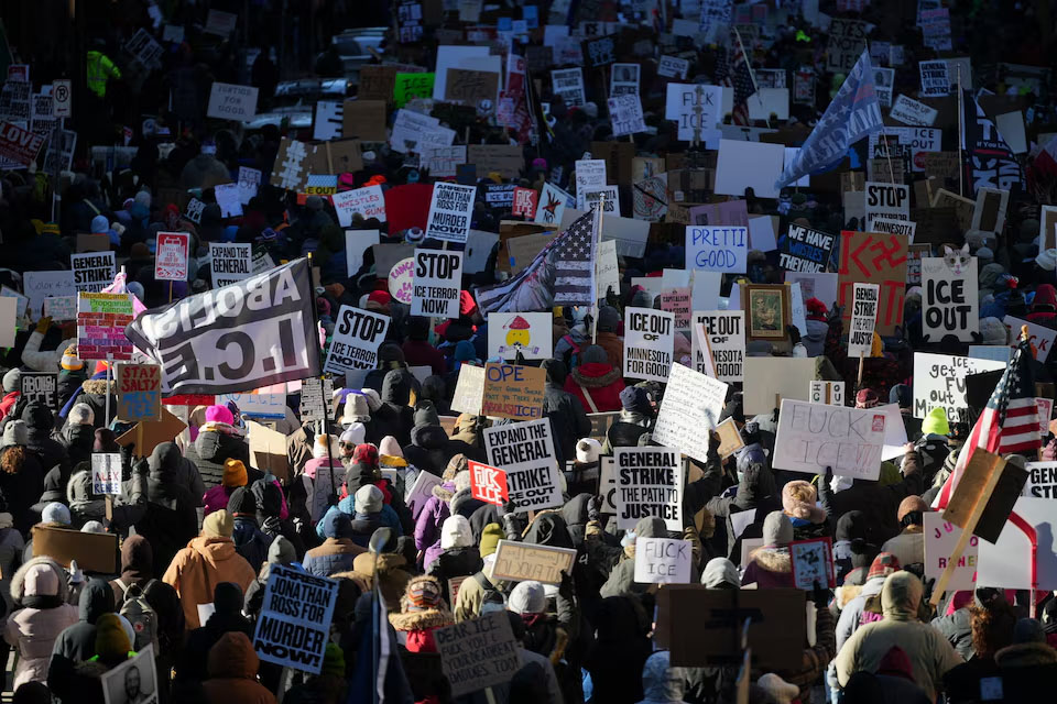 ဆန္ဒပြသူတွေဟာ “ICE ရပ်၊ အာဏာရှင်၊ ICE၊ ဘာဘီနုမ်းနဲ့ ထရမ့်ပ်တို့ကို အပြစ်ပေးပါ” စတဲ့ ဆိုင်းဘုတ်တွေ ကိုင်ဆောင်ပြီး ဆန္ဒဖော်ထုတ်ခဲ့တာပါ။