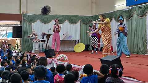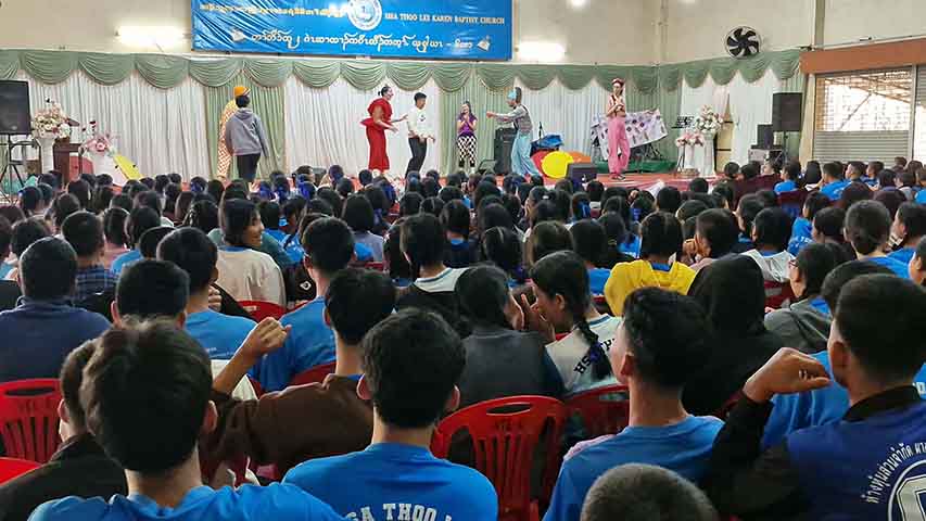 ထိုင်း-မြန်မာနယ်စပ်၊ မဲဆောက်မြို့ရှိ ဆာသူးလေ ကရင်ရွှေ့ပြောင်းစာသင်ကျောင်းမှာ ဖေဖော်ဝါရီ ၃ ရက် ဒီနေ့မနက်က အမေရိကန်နဲ့ ဥရောပနိုင်ငံတွေက ဆပ်ကပ်ပညာရှင်တွေလာရောက်ပြီး ကျောင်းသူ၊ ကျောင်းသားတွေနဲ့ ဆရာတွေကို ဖျော်ဖြေပေးခဲ့ပါတယ်။
