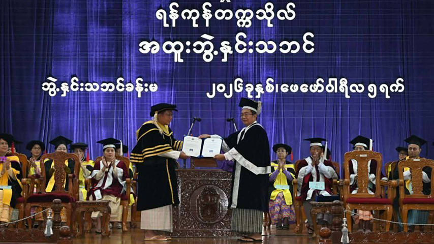 ဖေဖော်ဝါရီ ၅ ရက် ဒီနေ့ မနက်ပိုင်းက ရန်ကုန်တက္ကသိုလ် ဘွဲ့နှင်းသဘင်ခန်းမမှာ အထူးဘွဲ့နှင်းသဘင်ပြုလုပ်ပြီး စစ်ခေါင်းဆောင်ကို ဂုဏ်ထူးဆောင် ပြည်သူ့ရေးရာ စီမံခန့်ခွဲမှု ပါရဂူဘွဲ့ကို ပေးခဲ့တာ ဖြစ်ပါတယ်။